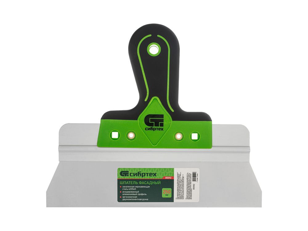 Шпатель фасадный с двухкомпонентной полимерной ручкой Сибртех 85592 — это надежный и эффективный инструмент, выполненный из нержавеющей стали 420S45. Предназначен для профессионального выравнивания поверхностей. Благодаря прочности и качественному исполнению обладает высокой производительностью и долгим сроком службы.
