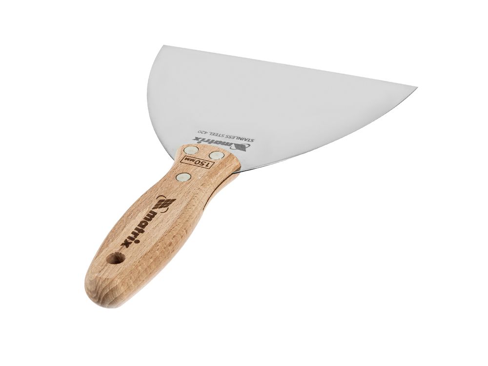 Шпательная лопатка Matrix 85619 с полотном из нержавеющей стали шириной 150 мм и буковой рукояткой предназначена для работы со строительными растворами. Применяется для нанесения различных смесей на поверхности, шпатлевания трещин и неровностей.