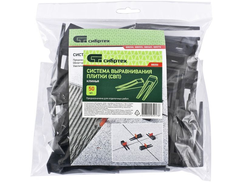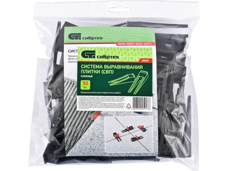 Система выравнивания плитки (СВП) Сибртех 88050 включает в себя клинья (50 шт. в пакете), облегчающие, совместно с зажимами Сибртех 88055 и 88073, укладку керамической и керамогранитной плитки толщиной 6-12 мм на стены или на пол. Изделия пригодятся не только начинающему мастеру, но и профессионалу. Благодаря инструментам для укладки плитка не смещается и не проседает во время высыхания, швы получаются ровными и аккуратными, что гарантирует качественный результат.