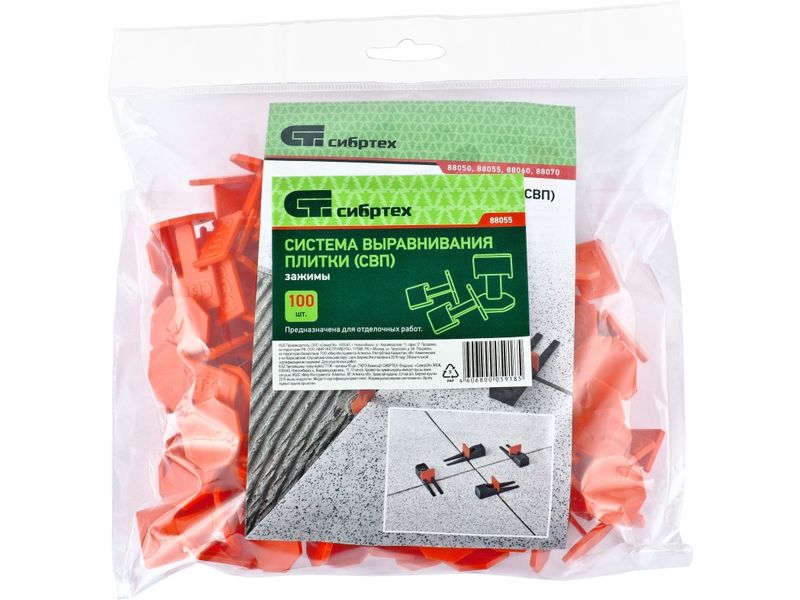 Система выравнивания плитки (СВП) Сибртех 88055 состоит из зажимов (100 шт. в пакете), используемых совместно с клиньями. Изделия позволяют добиться качественного результата за счет того, что межплиточные швы получаются ровными и аккуратными, керамическая или керамогранитная плитка не смещается, а клей распределяется равномерно. Зажимы для плитки (СВП) предназначены для формирования швов 1,5-1,7 мм.