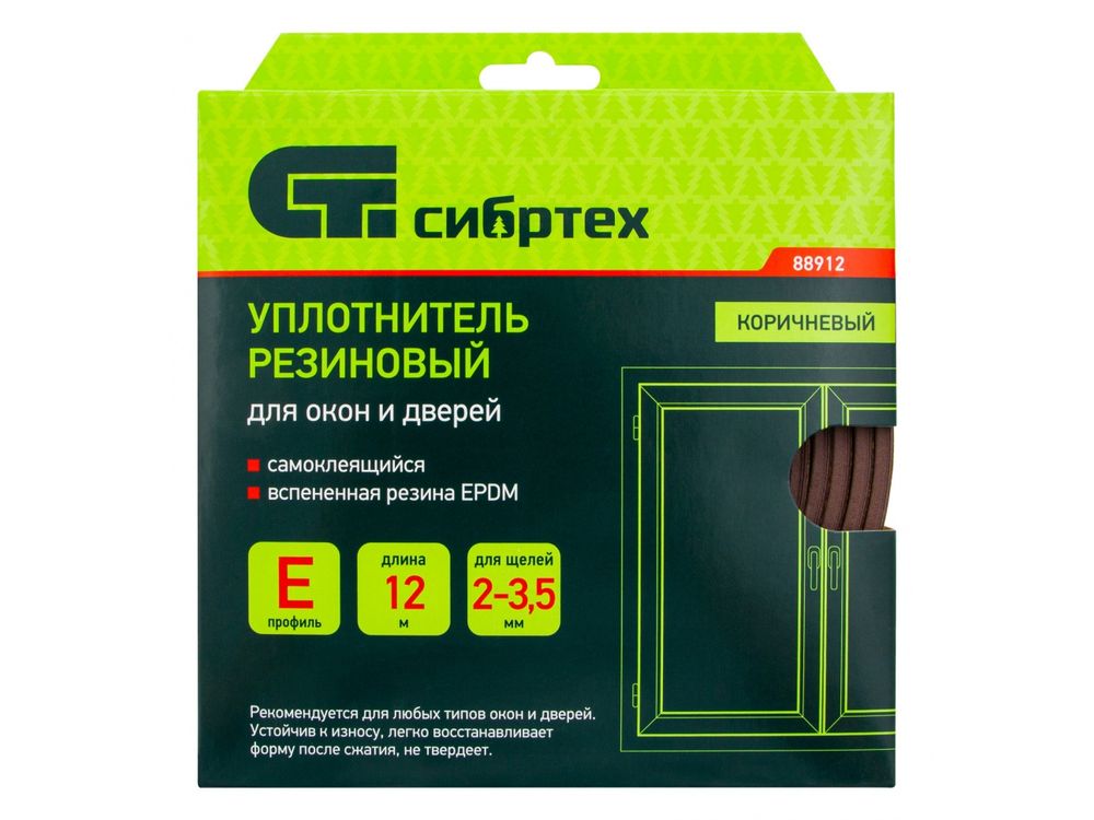 Коричневый резиновый уплотнитель Сибртех 88912 длиной 12 м, с профилем «E», предназначен для герметизации и уплотнения оконных и дверных блоков с целью предотвращения сквозняков и вибраций, защиты от влаги и пыли, создания эффективной тепло- и звукоизоляции. Клеевой слой обеспечивает высокую адгезию и надежную фиксацию. Использование уплотнителя позволяет значительно снизить энергетические и экономические затраты. Лента с E-профилем 9 х 4 мм подойдет для щелей размером 2-3,5 мм.