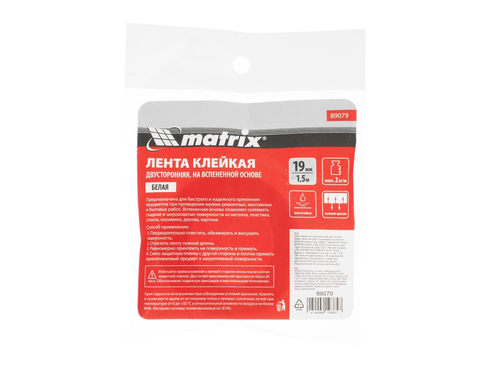 Двусторонняя клейкая лента на вспененной основе Matrix 89079 размером 19 х 1, 5 м, белого цвета, надежно фиксирует предметы, в том числе подвергающиеся вибрационным нагрузкам: зеркал, крючков, автомобильных молдингов. Подходит для материалов с различной структурой: металла, стекла, керамики, пластика, картона и т. д.