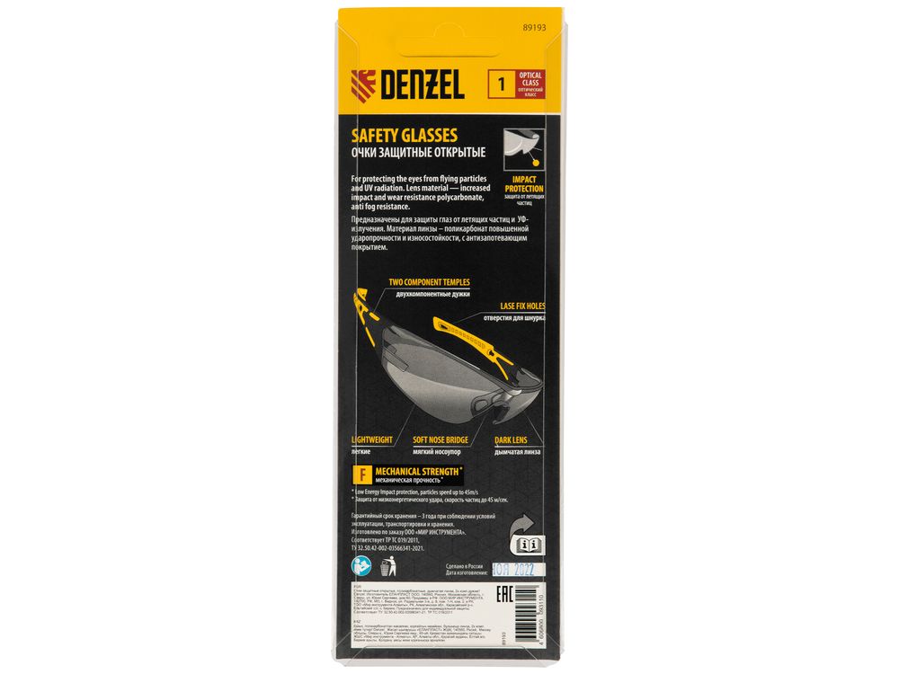 Легкие универсальные защитные очки открытого типа Denzel 89193 с поликарбонатными дымчатыми линзами и 2-компонентными дужками предназначены для защиты глаз от механических повреждений и УФ-излучения. Очкам присвоен класс механической прочности F, они обеспечивают защиту от высокоскоростных частиц с низкоэнергетическим ударом V-45 м/с. Очки используются во время работы с электро- и бензоинструментом, на производстве и в быту.