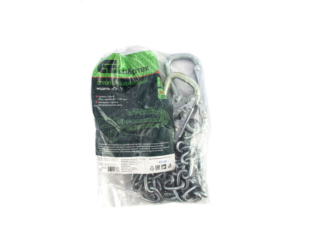 Цепной страховочный строп Сибртех 89508, модель «Г» с 2-мя карабинами, используется совместно со страховочно-удерживающими привязями для выполнения работ на высоте. Обеспечивает безопасность пользователя и оптимален для строительных, кровельных, монтажных и спасательных работ, в том числе связанных с огнем.