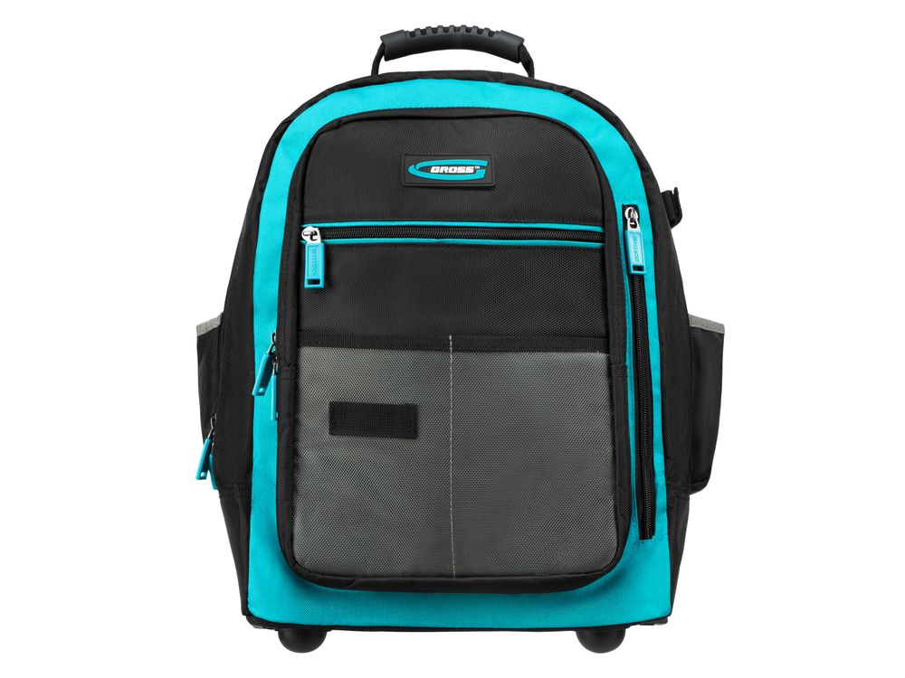 Рюкзак Gross 90275 размером 440 х 350 х 250 мм, с выдвижной рукояткой и колесами, используется для хранения и транспортировки ручного инструмента. В двух секциях с 16 внутренними и внешними карманами можно разместить все необходимые предметы. Рюкзак удобно брать в поездки и на выездные работы.