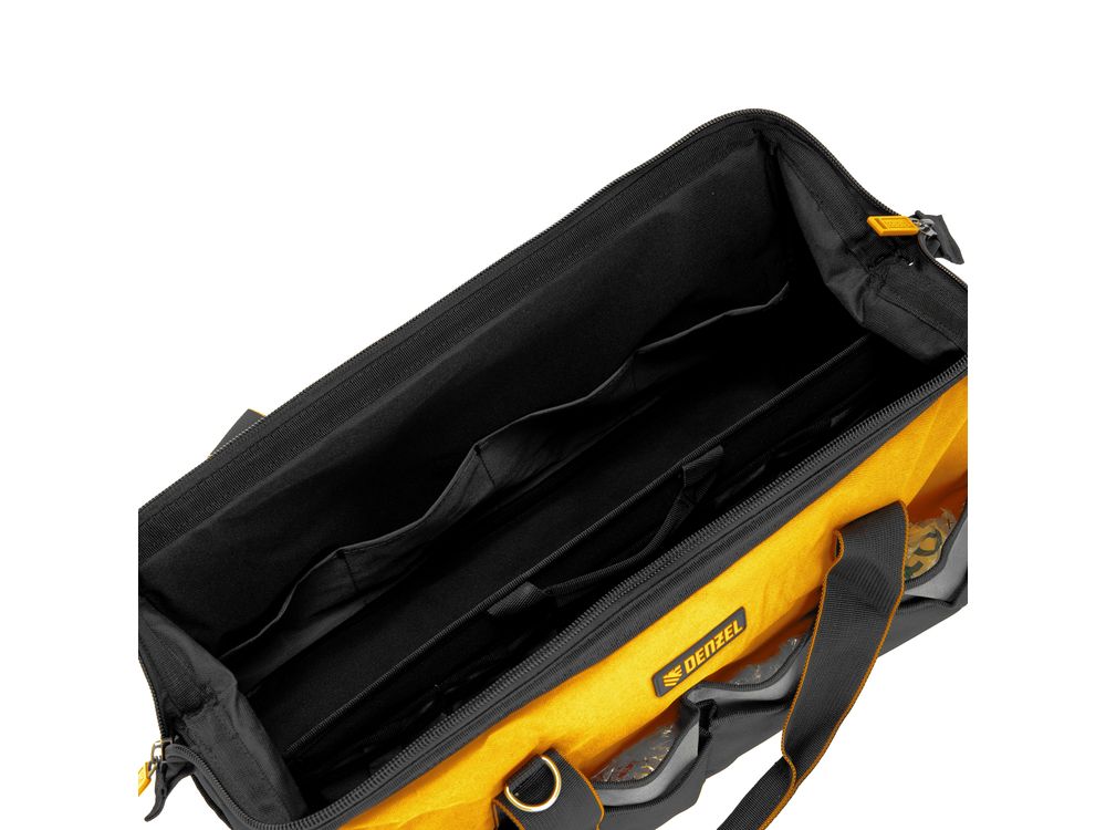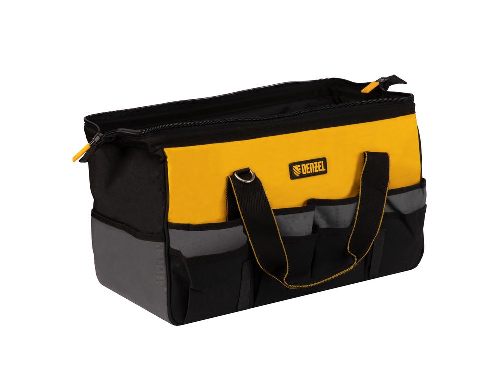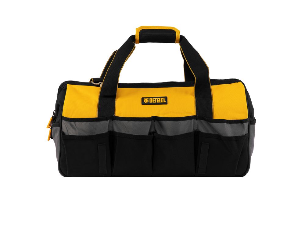 Сумка Denzel 90293 габаритами 500 х 245 х 300 мм с 20 карманами (в том числе съемным органайзером на 10 карманов) и наплечным ремнем, вмещает большое количество инструментов и используется для их хранения и транспортировки. Пригодится монтажнику, сантехнику, мастеру на выезде и автовладельцу.