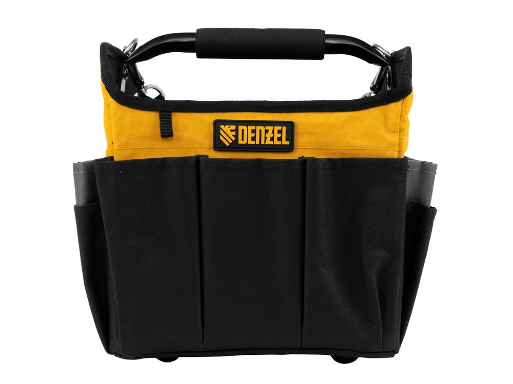 Переноска Denzel 90294 габаритами 260 х 240 х 300 мм, с наплечным ремнем, имеет вместительное основное отделение и 22 кармана. В ней можно разместить ручной и электроинструмент для хранения и транспортировки. Переноска пригодится в дороге, дома или в гараже.