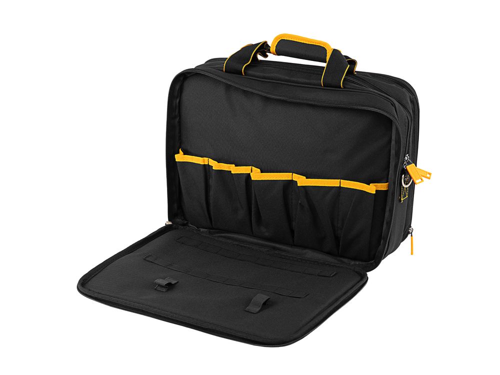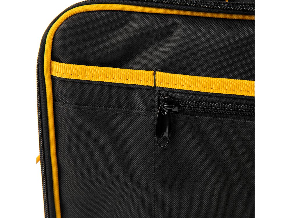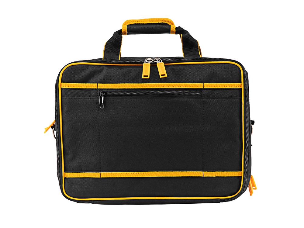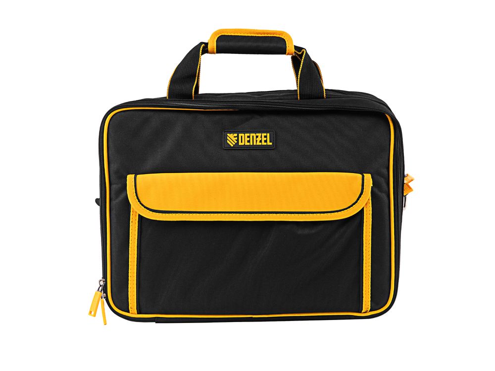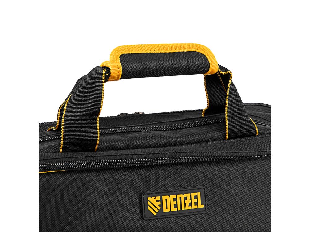Сумка Denzel 90295 габаритами 400 х 170 х 300 мм, с наплечным ремнем, имеет 3 отделения и 28 карманов, в которых можно разместить необходимые инструменты, оснастку и расходники. Пригодится дома, в гараже и в поездке.