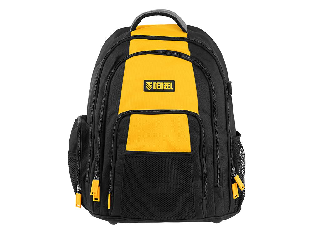 Рюкзак Denzel 90296 размером 365 х 190 х 430 мм, с 3 отделениями и 26 карманами (в том числе сетчатыми), предназначен для размещения и транспортировки ручного инструмента. 3 секции позволяют организовать упорядоченное хранение всех необходимых предметов. Рюкзак пригодится выездному мастеру.
