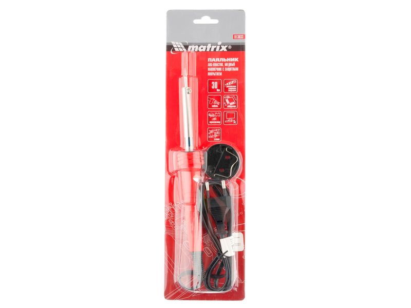 Паяльник Matrix 913033 мощностью 30 Вт используется для пайки транзисторов, микрочипов, электросхем и проводов. В качестве нагревательного элемента использована нихромовая спираль, что снижает риск поломки в случае падения или удара. Конусовидное жало оптимально для проведения точной пайки. Гальваническое покрытие защищает наконечник от внешних воздействий, что продлевает срок службы инструмента. Паяльник пригодится радиолюбителям и домашним мастерам.