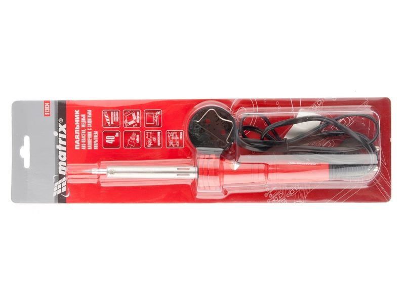 Паяльник Matrix 913034 мощностью 40 W работает от сети 220 В, изготовлен из ABS-пластика с пониженной теплопроводностью и имеет медный наконечник с долговечным покрытием. Используется для пайки транзисторов, микрочипов, электросхем и проводов. В качестве нагревательного элемента использована нихромовая спираль, что снижает риск поломки в случае падения или удара. Конусовидное жало оптимально для проведения точной пайки. Гальваническое покрытие защищает наконечник от внешних воздействий, что продлевает срок службы инструмента. Паяльник пригодится радиолюбителям и домашним мастерам.