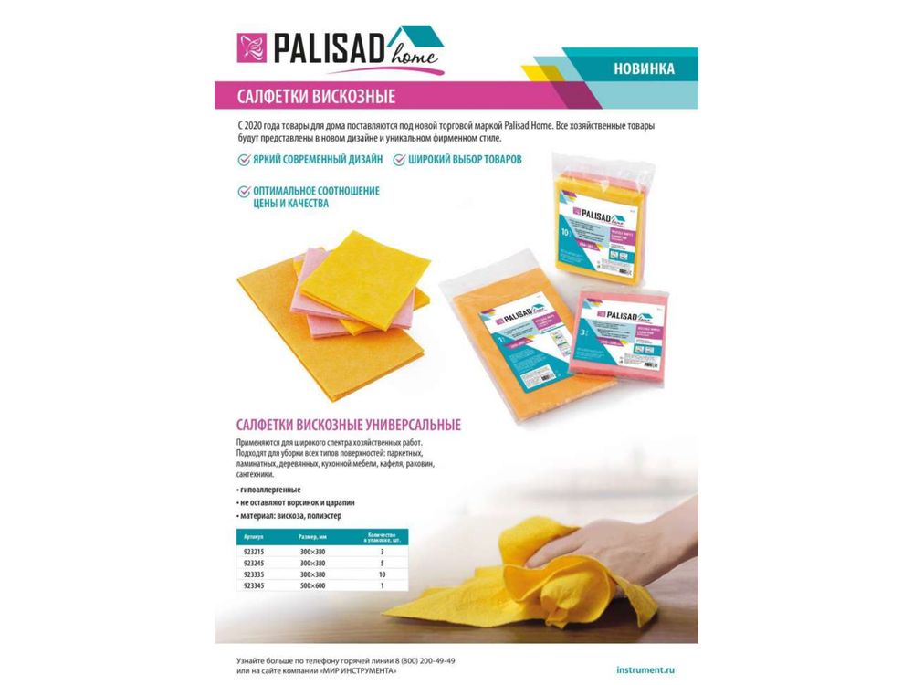 Вискозная салфетка Palisad Home 923345 за счет большого размера 500 х 600 мм оптимально подходит для мытья полов: паркета, ламината, линолеума, кафеля. Также ее можно применять для очистки мебели и сантехники.