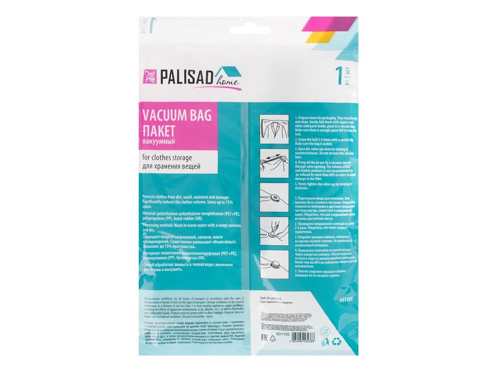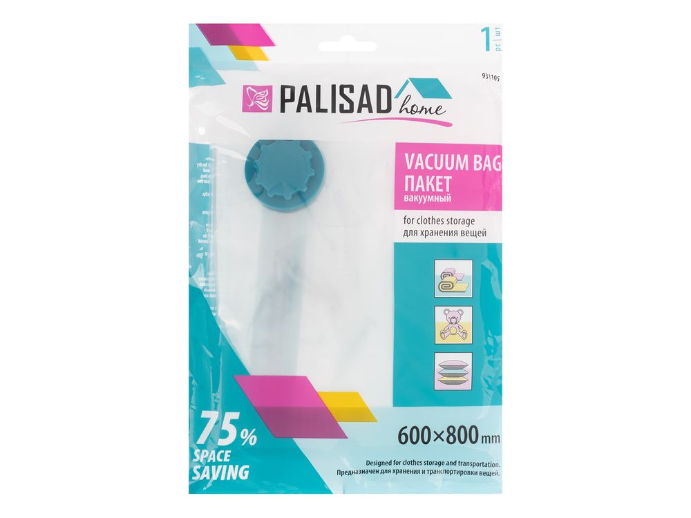 Вакуумный пакет для упаковки и хранения вещей Palisad Home 931105 с подвесом, размером 60 х 80 см, позволяет компактно и аккуратно разместить одежду, игрушки, постельные принадлежности в комоде, шкафу и других местах. Пакет из прочного полиэтилентерефталата толщиной 55 мкм надежно защищает вещи от повреждений, а также сырости, пыли, плесени, микробов и неприятных запахов.