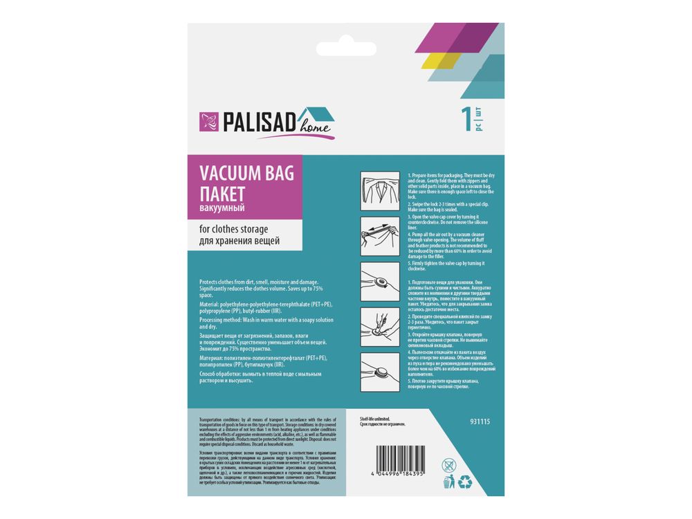 Вакуумный пакет для упаковки и хранения вещей Palisad Home 931115 размером 70 х 100 см позволяет компактно и аккуратно подготовить к транспортировке или разместить в зоне хранения одежду, игрушки, постельные принадлежности и т.д. Пакет из прочного полиэтилентерефталата толщиной 55 мкм надежно защищает вещи от повреждений, а также сырости, пыли, плесени, микробов и неприятных запахов.