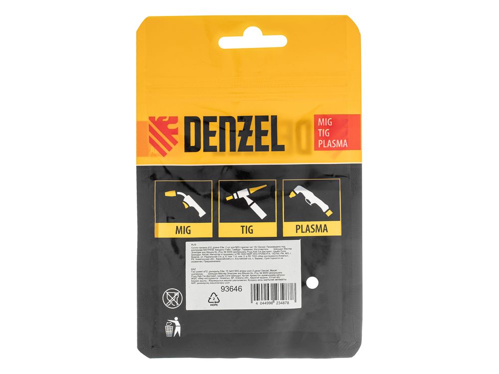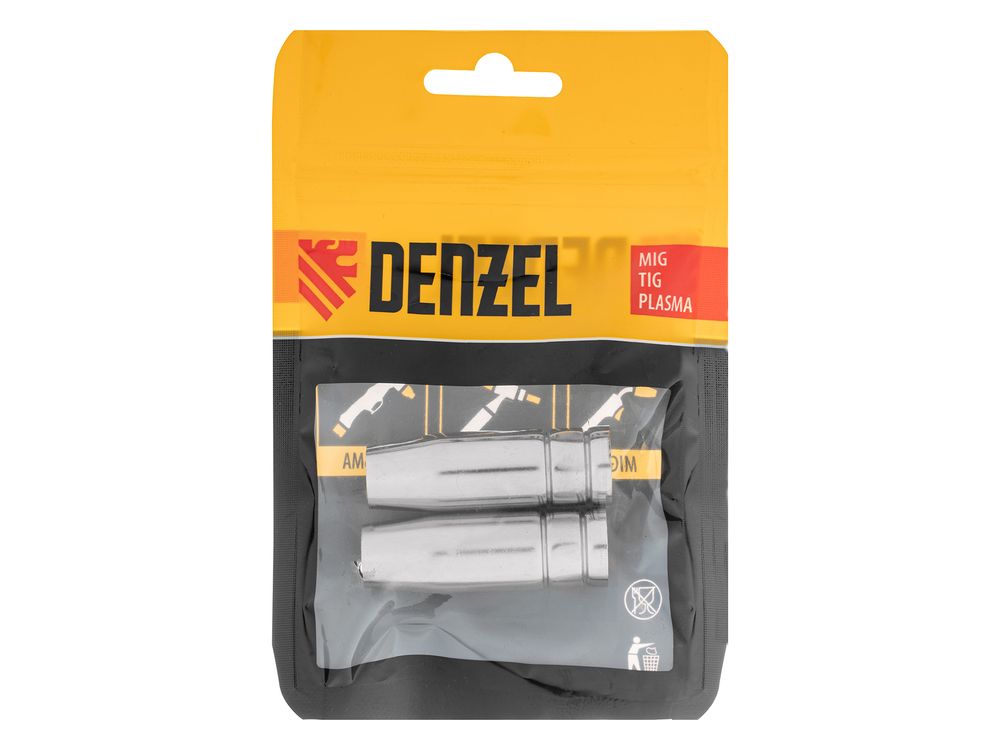 Газовое сопло Denzel 93646 диаметром 12 мм и длиной 53 мм, 2 шт. в упаковке, совместимо с MIG-горелками типа 15, в том числе с моделью Denzel 93641. Позволяет восстановить работоспособность горелки в случае изнашивания установленной детали. Подходит для проведения полуавтоматической сварки.
