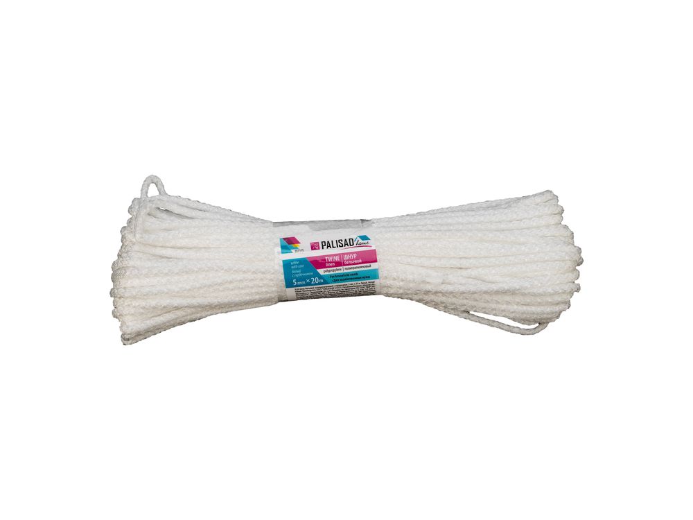 Белый полипропиленовый бельевой шнур Palisad Home 937115 с сердечником, диаметром 5 мм и длиной 20 м, используется для сушки белья, а также в качестве хозяйственной веревки в быту, на рыбалке или в походе. От обычной бельевой веревки для сушки он отличается сердечником из полипропилена, увеличивающим стойкость к нагрузкам. Шнур с полипропиленовой оплеткой выдерживает разрывную нагрузку до 70 кгс, устойчив к растяжению и не провисает под весом мокрых вещей.