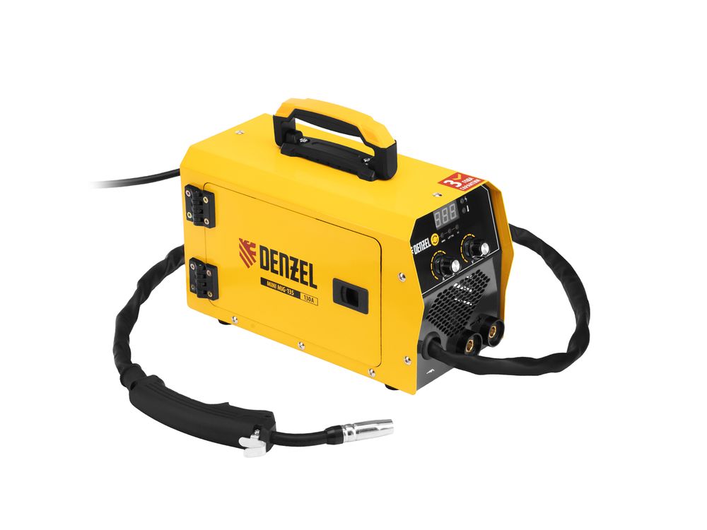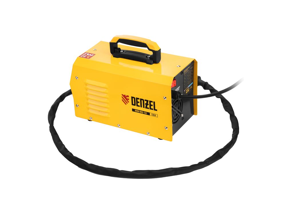 Инверторный аппарат полуавтоматической сварки Denzel Mini MIG-135 94308 предназначен для выполнения сварочных работ при постоянном токе до 130 A и продолжительности включения 60%. Доступные режимы: ручная дуговая сварка покрытым электродом (MMA), сварка порошковой (или флюсовой) проволокой диаметром 0,6/0,8 мм (FCAW), а также аргонодуговая сварка неплавящимся электродом (Lift TIG). Горелка TIG не входит в комплект поставки и приобретается отдельно.