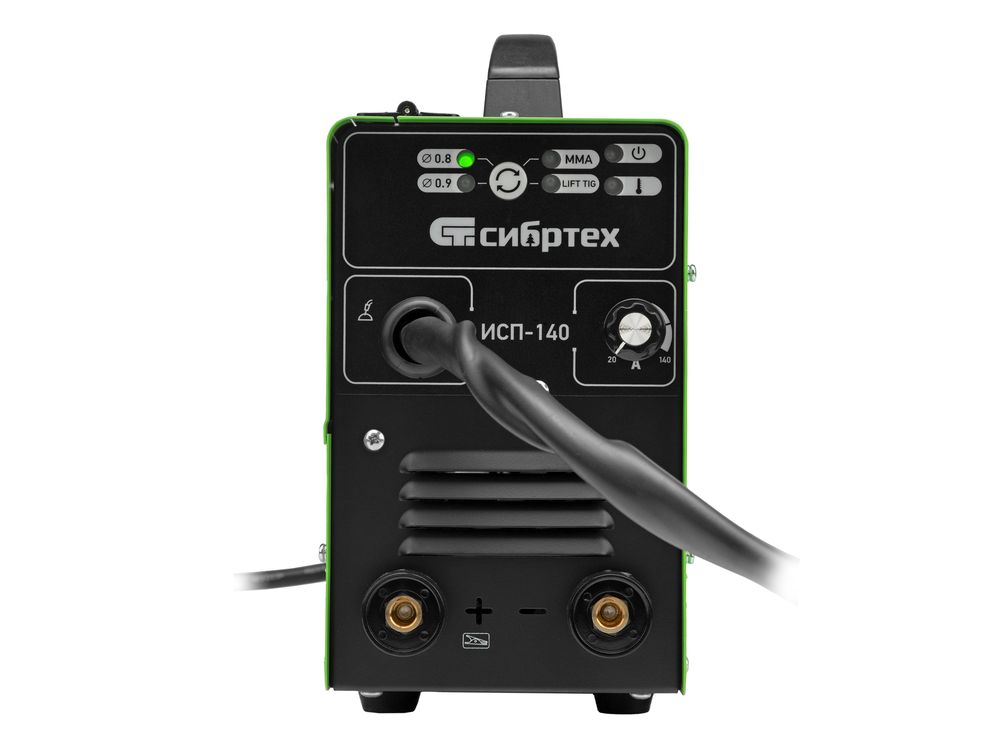 Инверторный аппарат полуавтоматической сварки Сибртех ИСП-140 94321 работает с максимальным сварочным током 140 А, время продолжительности включения составляет 60%. Аппарат позволяет работать в режимах MMA (сварка покрытым электродом диаметром до 4 мм), сварки флюсовой проволокой FCAW диаметром 0,8/0,9 мм без подачи газа и в режиме аргонодуговой сварки неплавящимся вольфрамовым электродом LIFT TIG (горелка в комплект не входит). Применение передовой инверторной технологии IGBT обеспечивает стабильный постоянный сварочный ток на выходе. Аппарат подходит для профессионального использования.