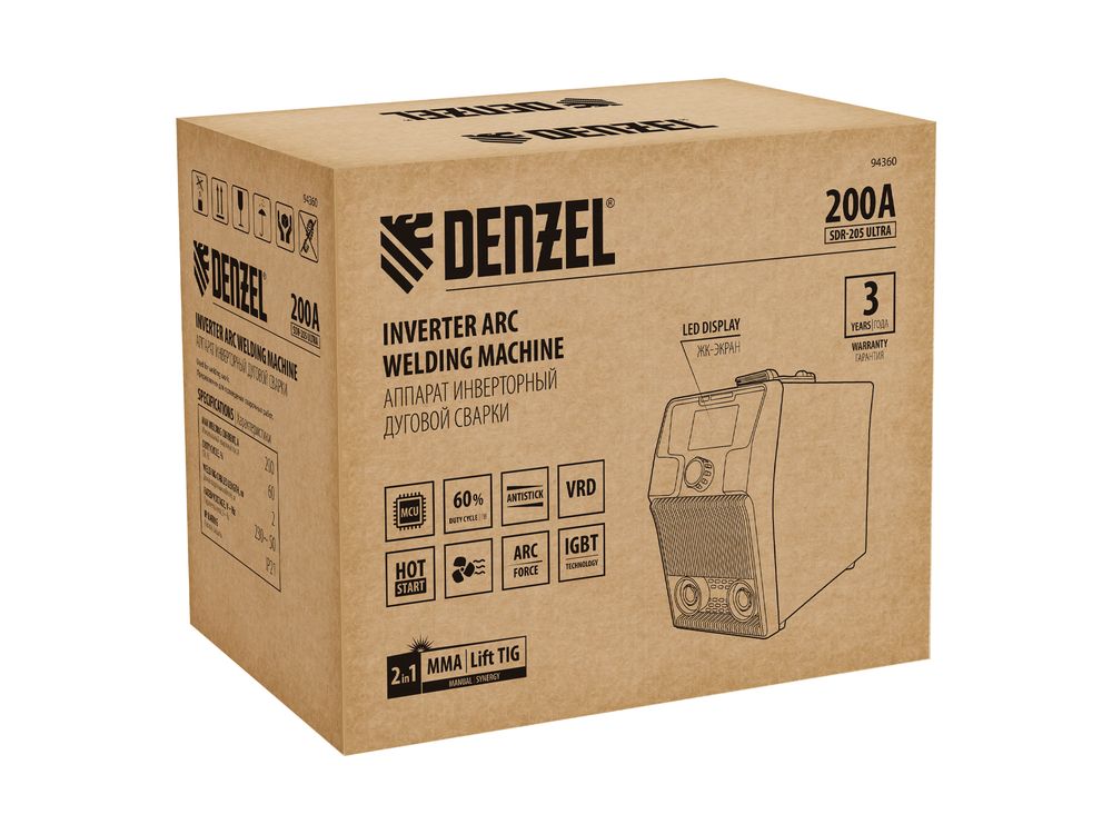 Инверторный аппарат дуговой сварки Denzel SDR-205 Ultra 94360 с продолжительностью включения 60% работает со сварочным током до 200 А. Используется для наплавки и сварки штучным покрытым электродом заготовок из низкоуглеродистых сталей в режиме MMA. Также может работать в режиме аргонодуговой сварки неплавящимся электродом LIFT TIG (горелка приобретается отдельно).