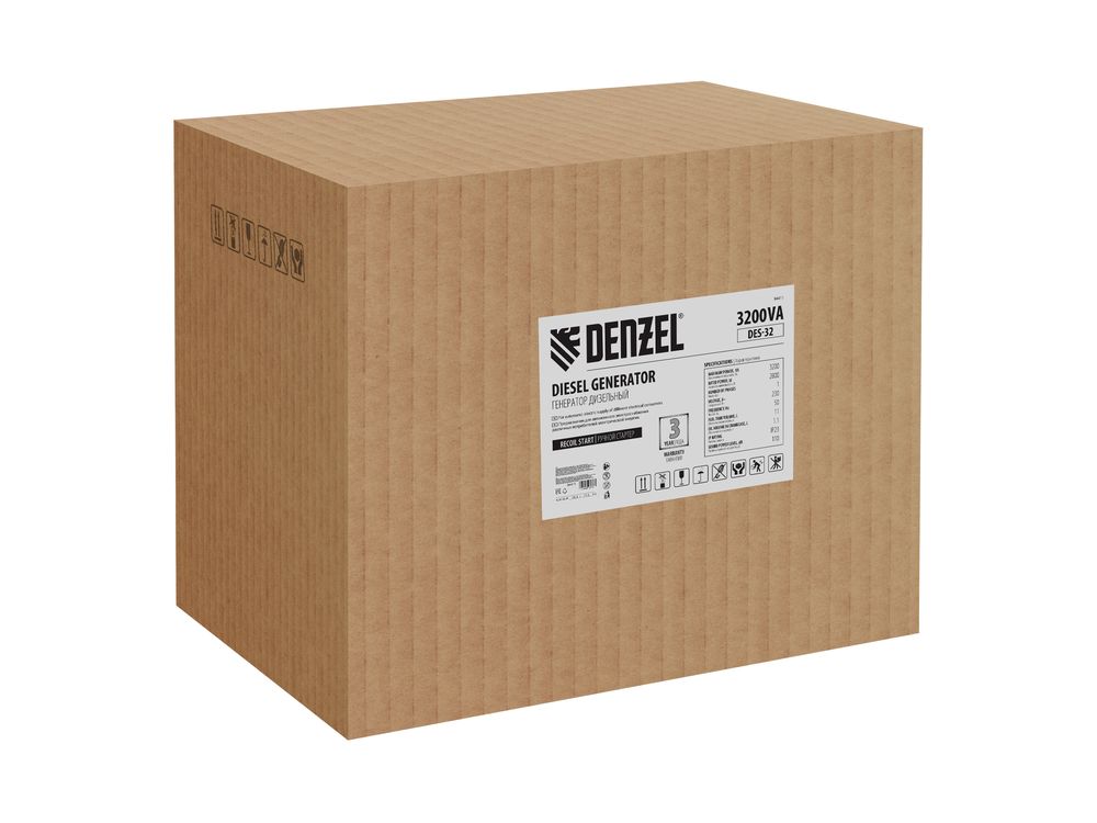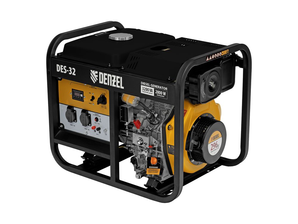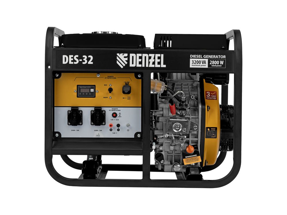 Генератор дизельный Denzel DES-32 94411 с объемом топливного бака 11 л, с ручным стартером, имеет максимальную выходную мощность 3,2 кВт и поддерживает напряжение в сети 230 В. Используется для снабжения энергией потребителей однофазного тока (осветительных приборов, бытовой техники, электроинструмента) при отсутствии доступа к стационарному источнику питания. Для подключения электроприборов служат 2 розетки 230 В/16 А. Клеммы постоянного тока 12 В позволяют заряжать автомобильные аккумуляторы, а двойной выход USB 5 В предназначен для подключения мобильных устройств (планшетов, смартфонов и т. д.). Генератор пригодится в загородном доме.