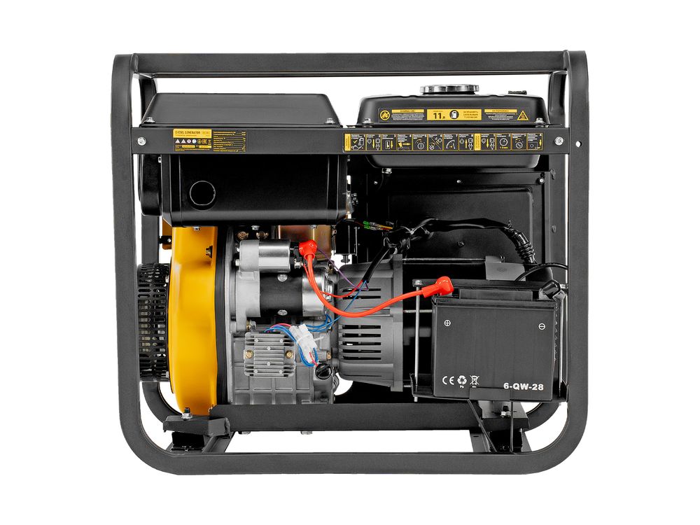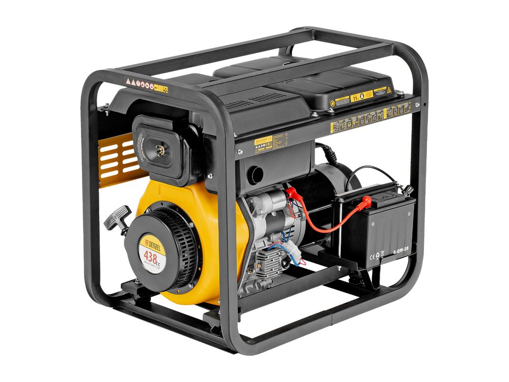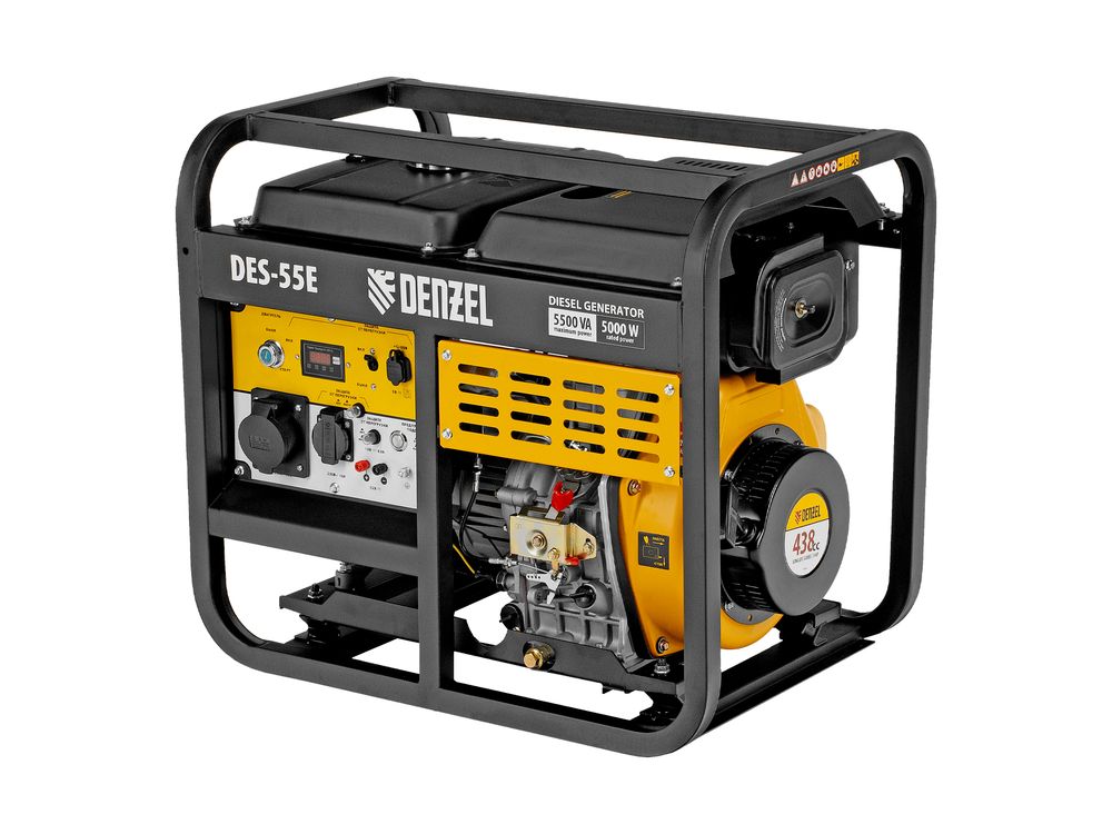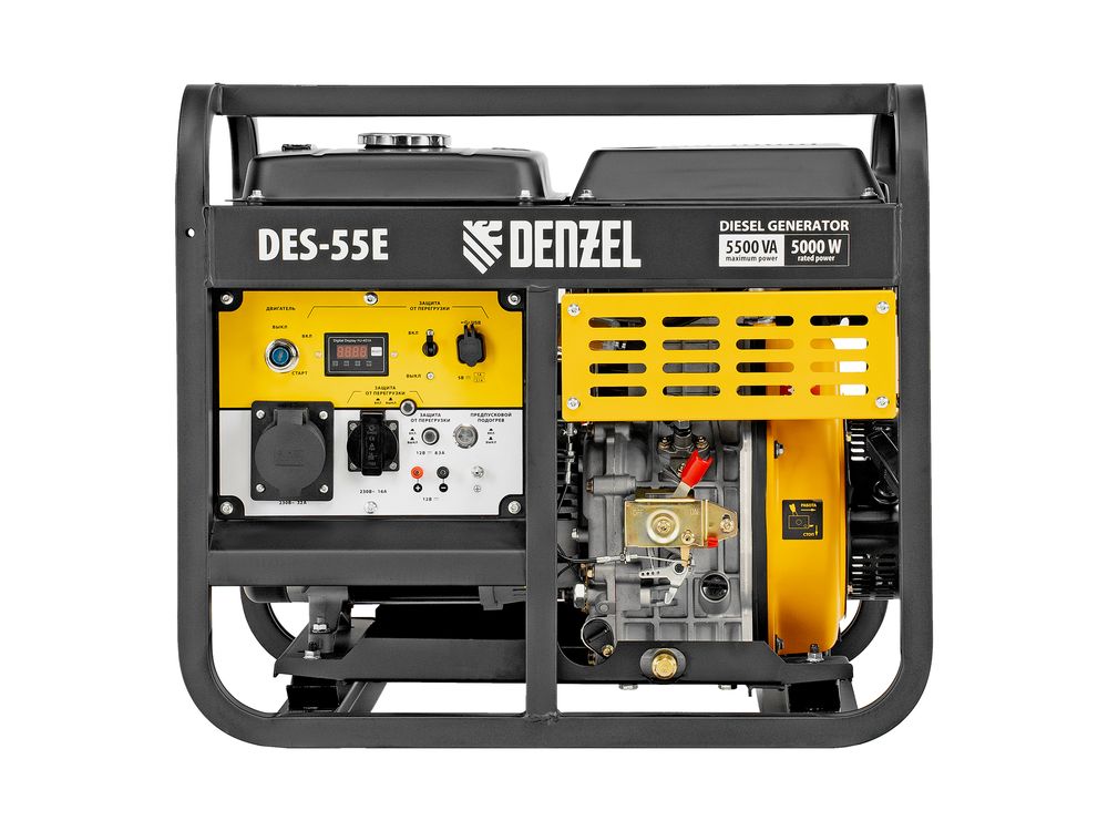 Генератор дизельный Denzel DES-55E 94414 с объемом топливного бака 11 л, с электростартером, имеет максимальную выходную мощность 5,5 кВт и поддерживает напряжение в сети 230 В. Используется для снабжения энергией потребителей однофазного тока (осветительных приборов, бытовой техники, электроинструмента) при отсутствии доступа к стационарному источнику питания. Для подключения электроприборов служат 2 розетки: 230 В/16 А и 230 В/32 А. Клеммы постоянного тока 12 В позволяют заряжать автомобильные аккумуляторы, а двойной выход USB 5 В предназначен для подключения мобильных устройств (планшетов, смартфонов и т. д.). Генератор пригодится в загородном доме.