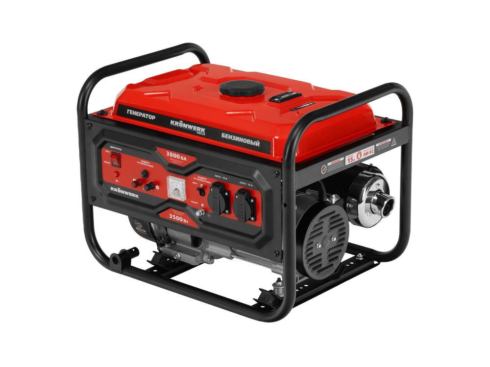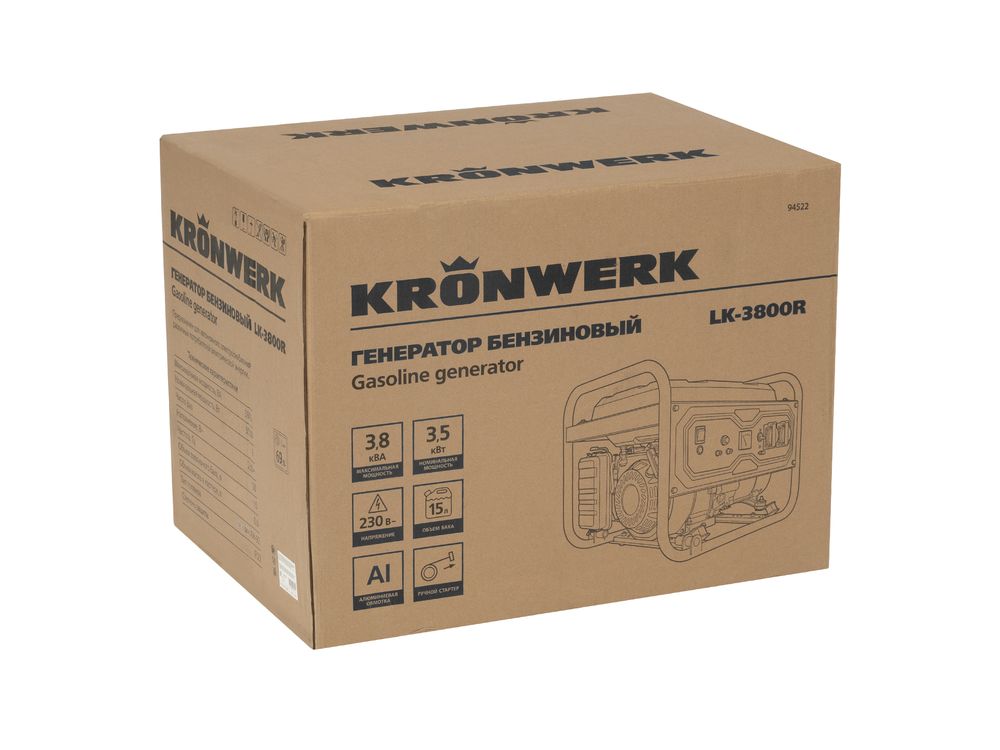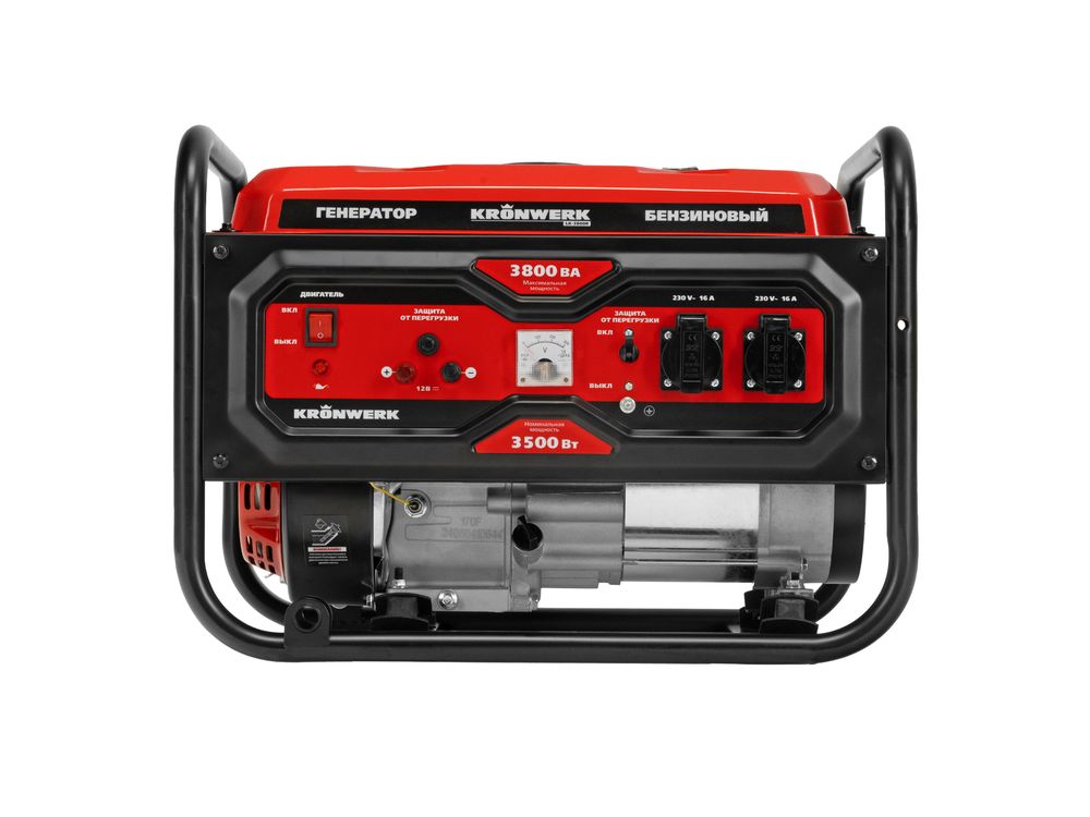 Бензиновый генератор Kronwerk LK-3800R 94522 максимальной мощностью 3,8 кВт, с ручным стартером, поддерживает напряжение 230 В и позволяет организовать автономную систему электроснабжения. Обеспечивает работоспособность электроинструмента, бытовой техники, осветительных приборов в условиях отсутствия подключения к электросети. Суммарная мощность потребителей не должна превышать 3,5 кВт. Предусмотрен выход постоянного тока 12 В для зарядки автомобильных аккумуляторов.