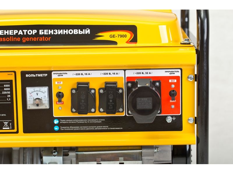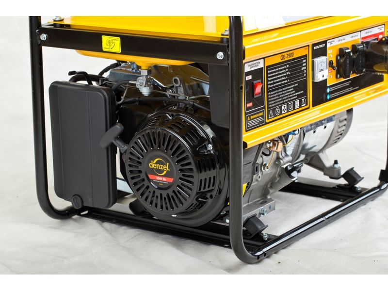 Генератор Denzel GE 7900 94638, 220 В / 50 Гц, мощностью 6,5 кВт, с ручным стартом и объемом бака 25 л, выдерживает большие нагрузки и подходит для питания мощного оборудования на даче, строительной площадке, в торговой точке. Генератор оснащен 3 розетками, одна из которых силовая, что позволяет подключать промышленное оборудование. Полного бака хватает на 8,5 ч работы без дозаправки.