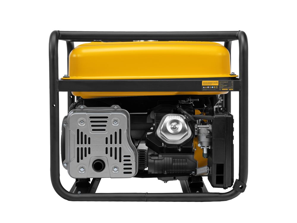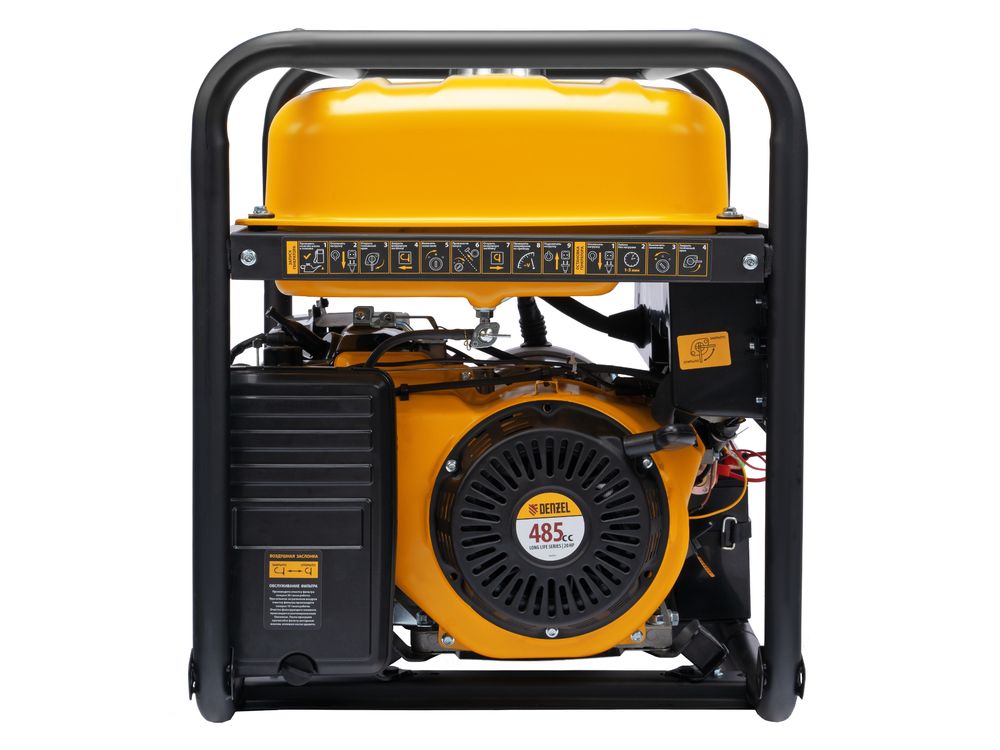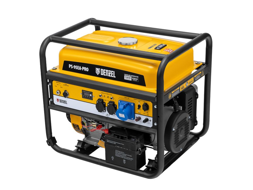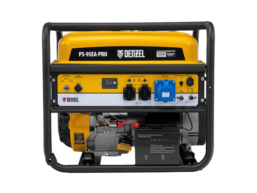 Бензиновый генератор Denzel PS-95EA-PRO 946935 максимальной мощностью 9,5 кВт, с баком объемом 40 л, разъемом ATS и электрическим стартером, поддерживает напряжение в сети 230 В и способен выдавать 8,5 кВт номинальной мощности благодаря двигателю увеличенного объема 485 см3. Предназначен для обеспечения энергией электроинструмента, бытовой и садовой техники, незаменим в загородном доме и на строительной площадке.,Подключить приборы можно при помощи 2-х евророзеток 230 В/16 А с индивидуальными предохранителями, для мощного оборудования предусмотрена силовая розетка на 32 А. Есть возможность снять полную мощность — для этого предназначены силовые клеммы. Благодаря двойному выходу постоянного тока USB 5 В можно вовремя подзарядить мобильные гаджеты.