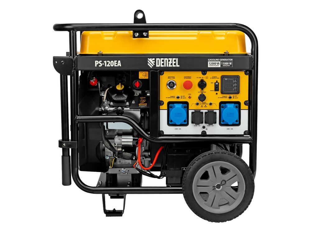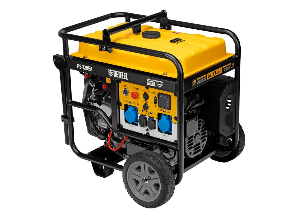 Бензиновый генератор Denzel PS-120EA 946964 максимальной мощностью 12 кВт, с баком объемом 40 л, разъемом ATS и электрическим стартером, поддерживает напряжение в сети 230 В. Предназначен для обеспечения питанием приборов и оборудования в случае отсутствия стационарной сети или перебоев в ее работе. Разъем USB 5 В позволяет заряжать мобильные устройства. Подключение потребителей производится при помощи 2-х розеток 230 В/16 А, а также 2-х силовых розеток 230 В/32 А.,Для работы с мощным оборудованием можно воспользоваться возможностью прямого подключения кабелей через распределительную коробку. Генератор пригодится в загородном доме, на производстве или строительной площадке.