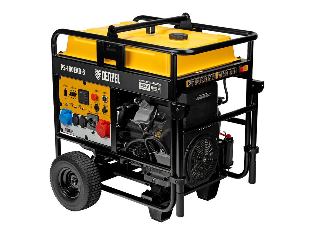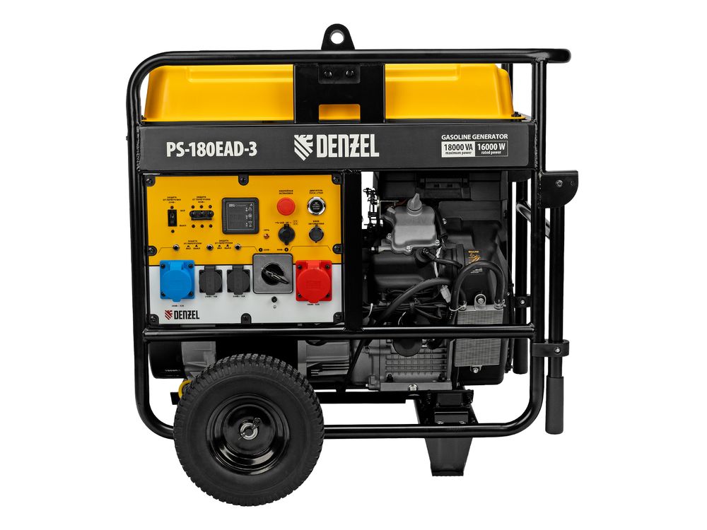 Бензиновый генератор Denzel PS-180EAD-3 946994 максимальной мощностью 18 кВт, с баком объемом 65 л, разъемом ATS, переключателем режима и электрическим стартером, способен поддерживать напряжение в сети 230/400 В. Предназначен для обеспечения питанием приборов и оборудования в случае отсутствия стационарной сети или перебоев в ее работе. Подключение потребителей производится при помощи 2-х розеток 230 В/16 А, а также силовой розетки 230 В/32 А и розетки трехфазного тока 400 В/32 А. Разъем USB 5 В позволяет заряжать мобильные устройства.,Мощное оборудование можно подключить напрямую через распределительную коробку. Генератор работает как в трехфазном, так и в однофазном режиме без потери мощности. Выбор режима осуществляется при помощи переключателя на передней панели. Генератор пригодится в загородном доме, на производстве или строительной площадке.