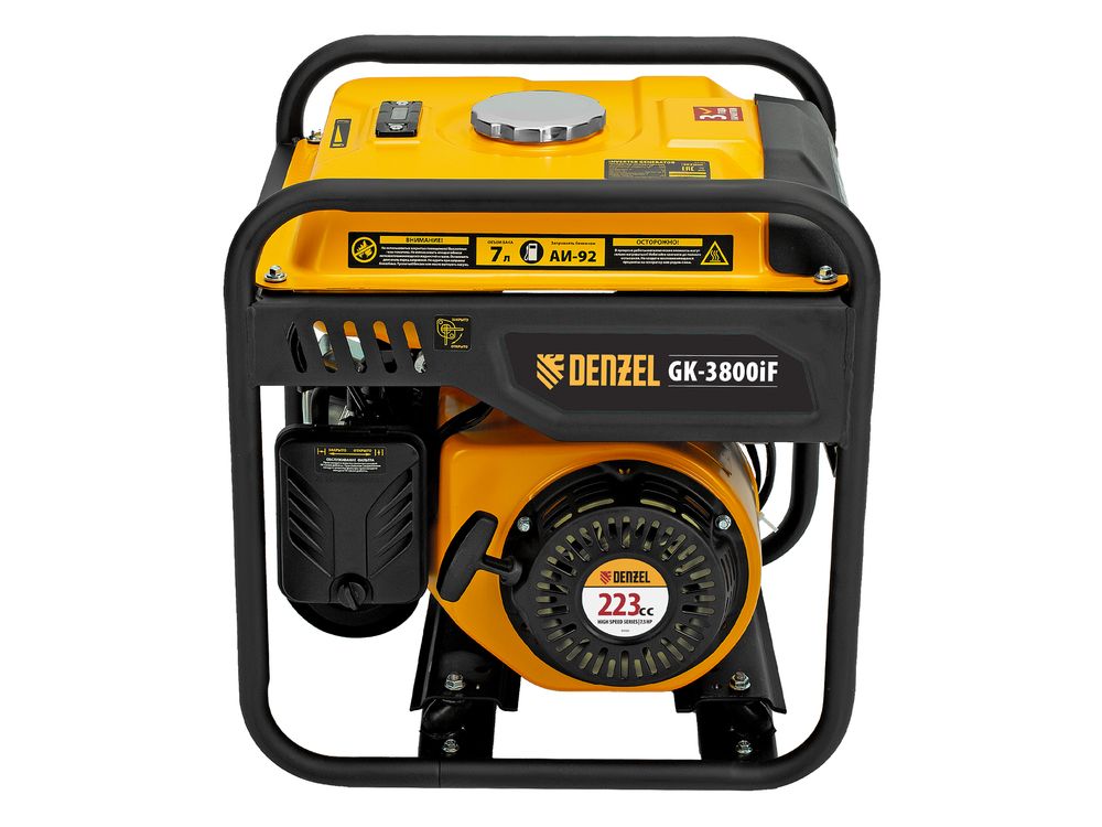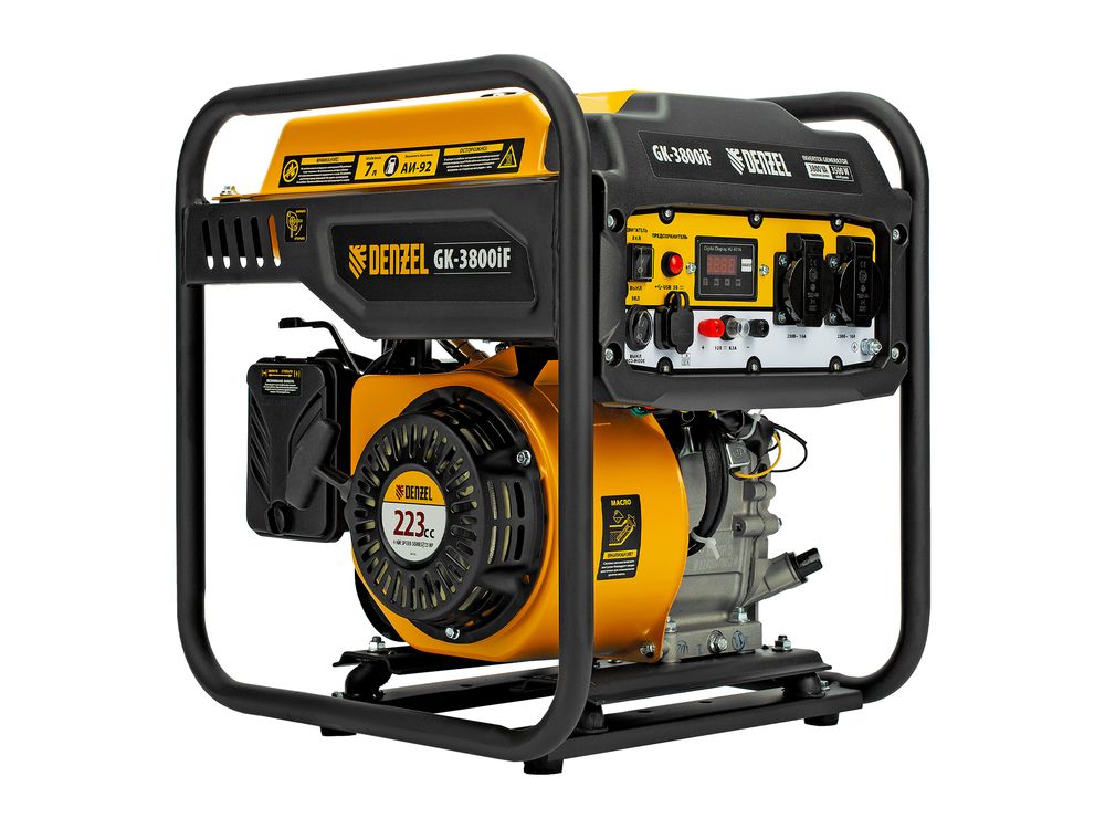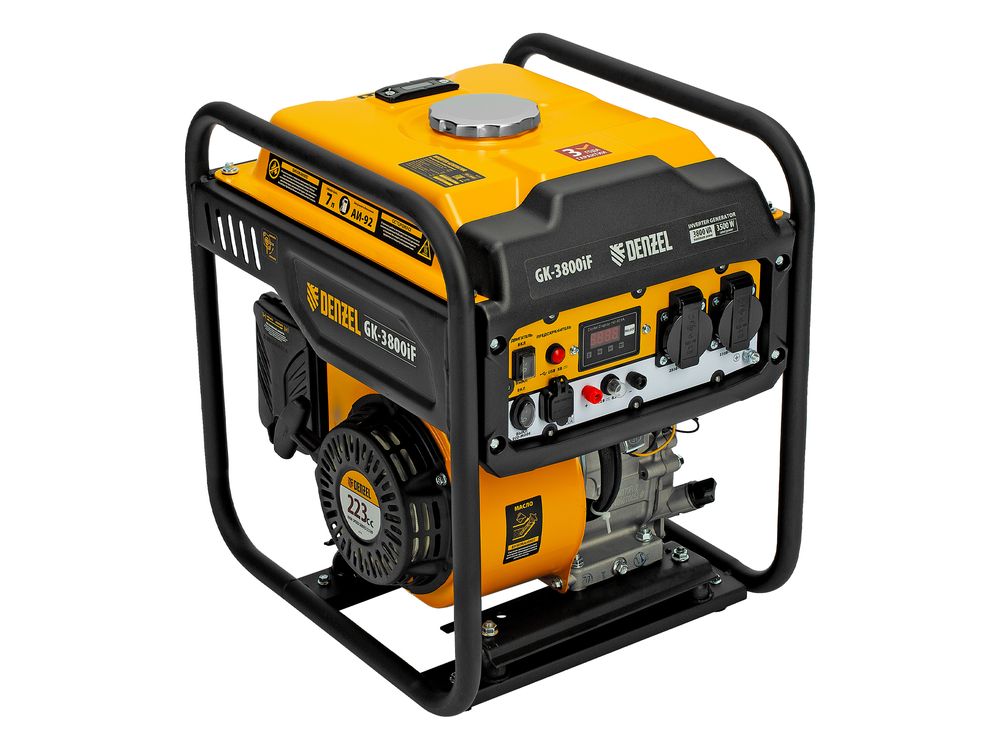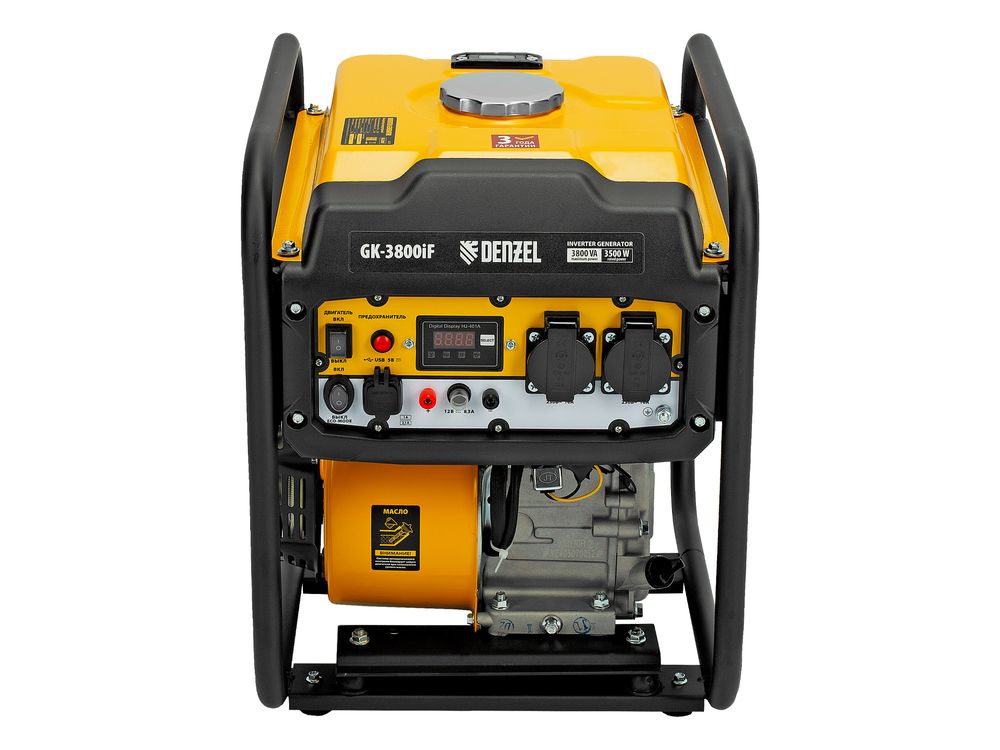 Инверторный генератор Denzel GK-3800iF 94708 максимальной мощностью 3,8 кВт, с ручным стартом, поддерживает напряжение 230 В и предназначен для питания осветительных приборов, бытовой техники, электроинструмента и т.д. в условиях отсутствия электросети или перебоев в ее работе. Обеспечивает подачу стабильного тока, подходит для подключения потребителей, чувствительных к качеству электроэнергии: газовых котлов, серверных станций, цифровой техники. Предусмотрена возможность подключения мобильных устройств к выходу USB 5 В. Клеммы постоянного тока 12 В можно использовать для зарядки автомобильных аккумуляторов. Генератор незаменим на дачном участке.