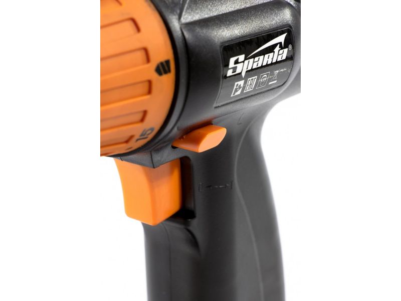 Аккумуляторная дрель-шуруповерт Sparta предназначена для бытового использования. Применяется для закручивания шурупов, саморезов, болтов и другого крепежа. А также с ее помощью можно сверлить отверстия диаметром до 12 мм в древесине и до 10 мм в металле. Дрель-шуруповерт имеет 16 режимов регулировки крутящего момента (макс. 10 Нм) для выбора силы затягивания крепежа. А возможность плавной регулировки частоты вращения шпинделя 0-550 об/мин позволяет выбрать оптимальный режим работы. Преимущества :Быстрозажимной патрон обеспечивает легкую замену оснастки. Встроенный реверс позволяет менять направление вращения патрона для безопасного выкручивания оснастки при ее застревании. Аккумулятор 1, 5 Ач обеспечивает работу в течение часа. Предусмотрено специальное гнездо в корпусе для крепления бит, поэтому оснастка всегда находится под рукой. Руки не устают даже при продолжительной работе — опция блокировки кнопки пуска избавляет от необходимости ее постоянного удержания. Дрель-шуруповерт весит 2, 1 кг и имеет эргономичную рукоятку, поэтому с ней удобно работать даже в труднодоступных местах.