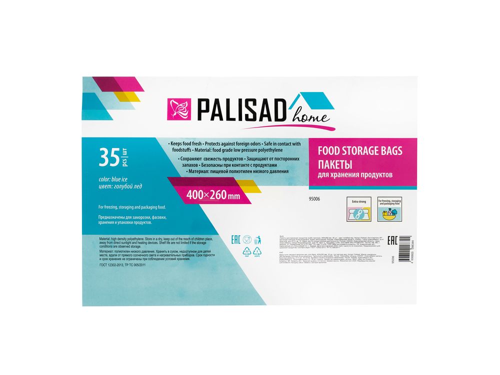 Особо прочные пакеты для хранения продуктов Palisad Home 95006 цвета «голубой лед», размером 400 х 260 мм, 35 шт. в упаковке, используются для хранения продуктов. Оптимальны для фасовки мелкой и легкой пищевой продукции, незаменимы в быту.