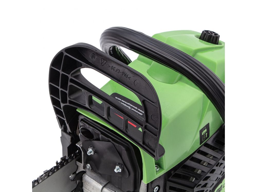 Безопасность — пила оснащена блокировкой от случайного запуска и тормозом цепи, который моментально срабатывает при отскоке инструмента.