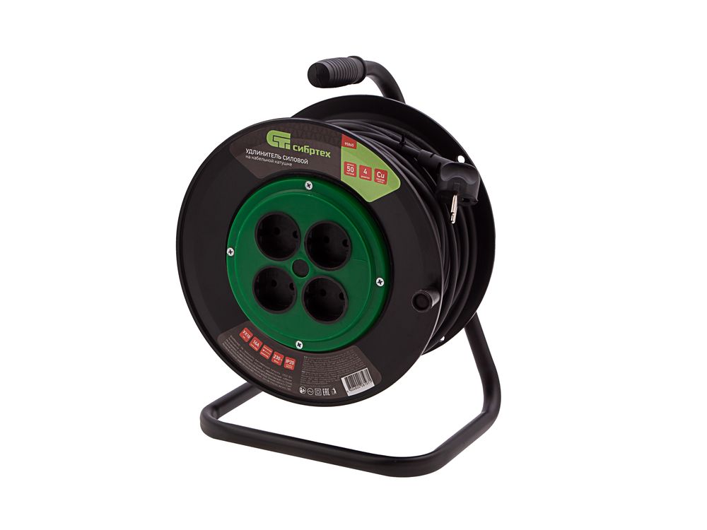 Силовой удлинитель Сибртех 95865 типа УХ10, 16 А, тип кабеля ПВС, на кабельной катушке, с 4 розетками, используется для подключения электроприборов на расстоянии до 50 м от стационарного источника электропитания. При этом суммарная мощность подключенных потребителей энергии не должна превышать 3500 Вт. Металлическая стойка сетевого удлинителя полая внутри, что облегчает конструкцию. Удлинитель пригодится во время строительных работ на дачном участке.