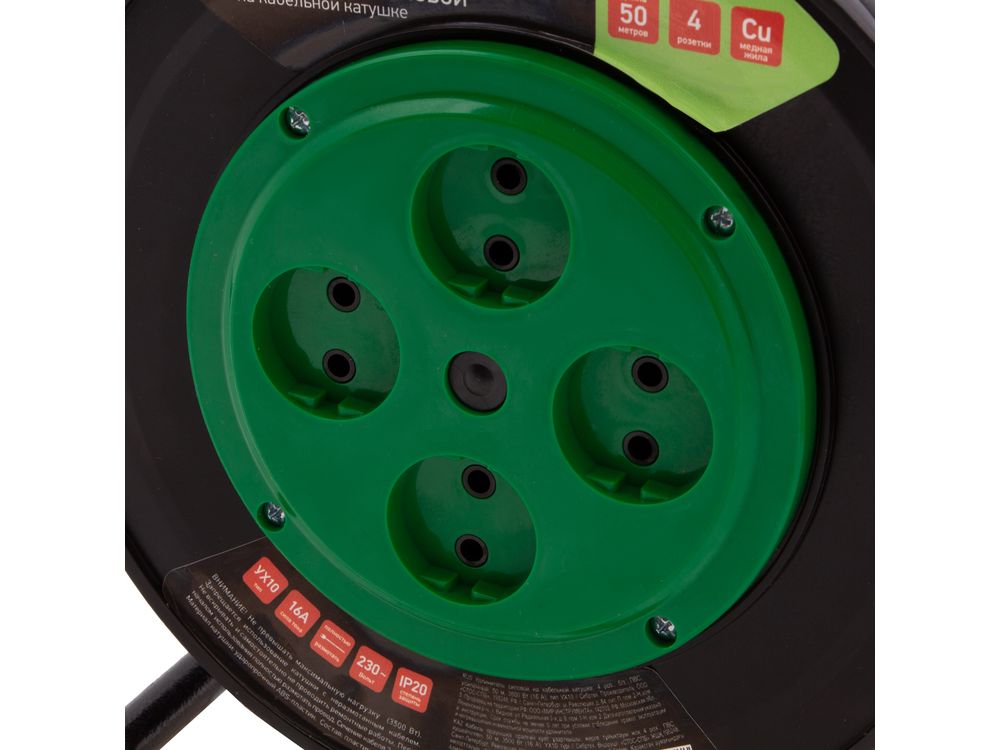 Купить Удлинитель силовой 50 м, 16А, тип УХ10, ПВС, усиленный, на кабельной катушке, 4 розетки без заземления