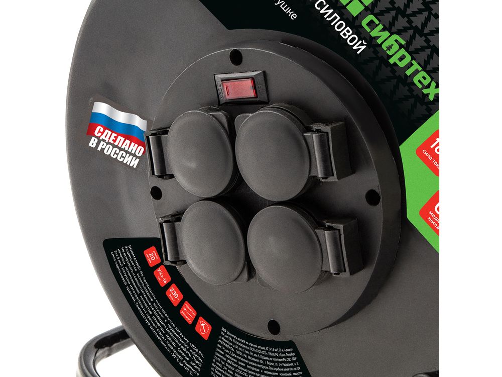 Силовой удлинитель на стальной катушке Сибртех 95875 типа УХз16, с кабелем КГ 3 х 1,5 мм и 4 розетками, рассчитан на силу тока 16 А и позволяет использовать электрооборудование суммарной мощностью до 350 Вт на расстоянии до 20 м от источника электроснабжения. Стальной корпус катушки выдерживает интенсивное использование. Изделие предназначено для выполнения профессиональных работ в строительстве и на производстве.