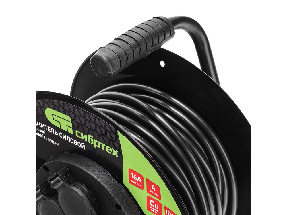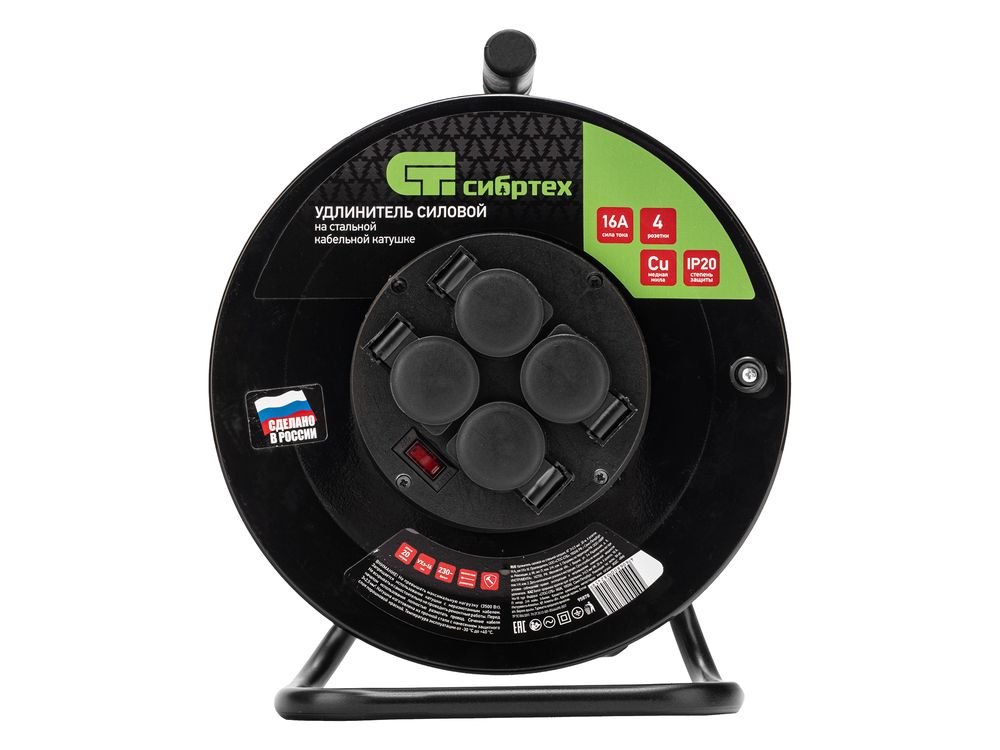 Силовой удлинитель на стальной катушке Сибртех 95878, 16 А, тип УХз-16, кабель КГ 3 х 2,5 мм, с 4 розетками, позволяет использовать электрооборудование на расстоянии до 20 м от источника электроснабжения. Выдерживает нагрузку до 3500 Вт. Стальной корпус катушки рассчитан на интенсивное использование. Розеточная группа выполнена из пластика, что позволило уменьшить вес сетевого удлинителя. Изделие предназначено для профессиональных работ в строительстве и на производстве.
