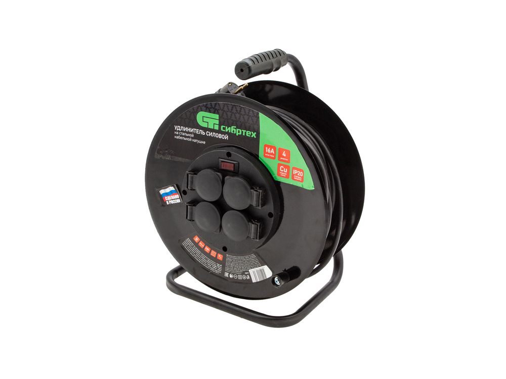 Силовой удлинитель на стальной катушке Сибртех 95879, 16 А, тип УХз-16, кабель КГ 3 х 2,5 мм, с 4 розетками, позволяет использовать электрооборудование на расстоянии до 30 м от источника электроснабжения. Выдерживает нагрузку до 3500 Вт. Стальной корпус катушки рассчитан на интенсивное использование. Розеточная группа выполнена из пластика, что позволило уменьшить вес сетевого удлинителя. Изделие предназначено для профессиональных работ в строительстве и на производстве.