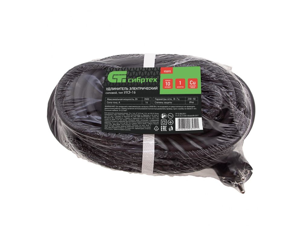 Силовой удлинитель Сибртех 95895, тип УХЗ-16, 16 А, тип кабеля КГ 3 х 2,5 мм, с 1 розеткой, позволяет подключать электрооборудование к сети на расстоянии до 10 м от стационарного источника электроснабжения. Медножильный кабель выдерживает нагрузку до 3500 Вт и рассчитан на длительное использование. Розетка закрывается защитной крышкой, предотвращающей попадание грязи и влаги на разъемы. Сетевой удлинитель используется в строительстве и на производстве.