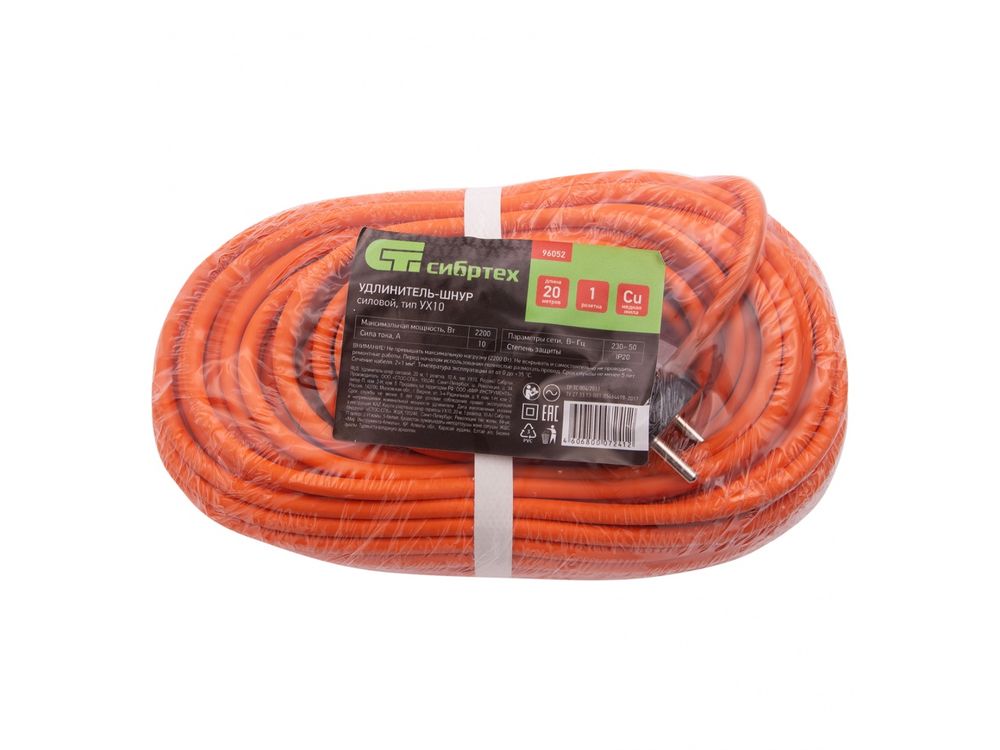 Силовой удлинитель-шнур Сибртех 96052, тип УХ10, с 1 розеткой, рассчитан на силу тока 10 A и позволяет подключать к электросети электроприборы мощностью до 2200 Вт на расстоянии до 20 м от источника электроснабжения. Яркий оранжевый кабель хорошо заметен даже в густой траве и среди строительного мусора. Сетевой удлинитель используется во время строительных и монтажных работ, а также пригодится дома, на даче или в гараже.