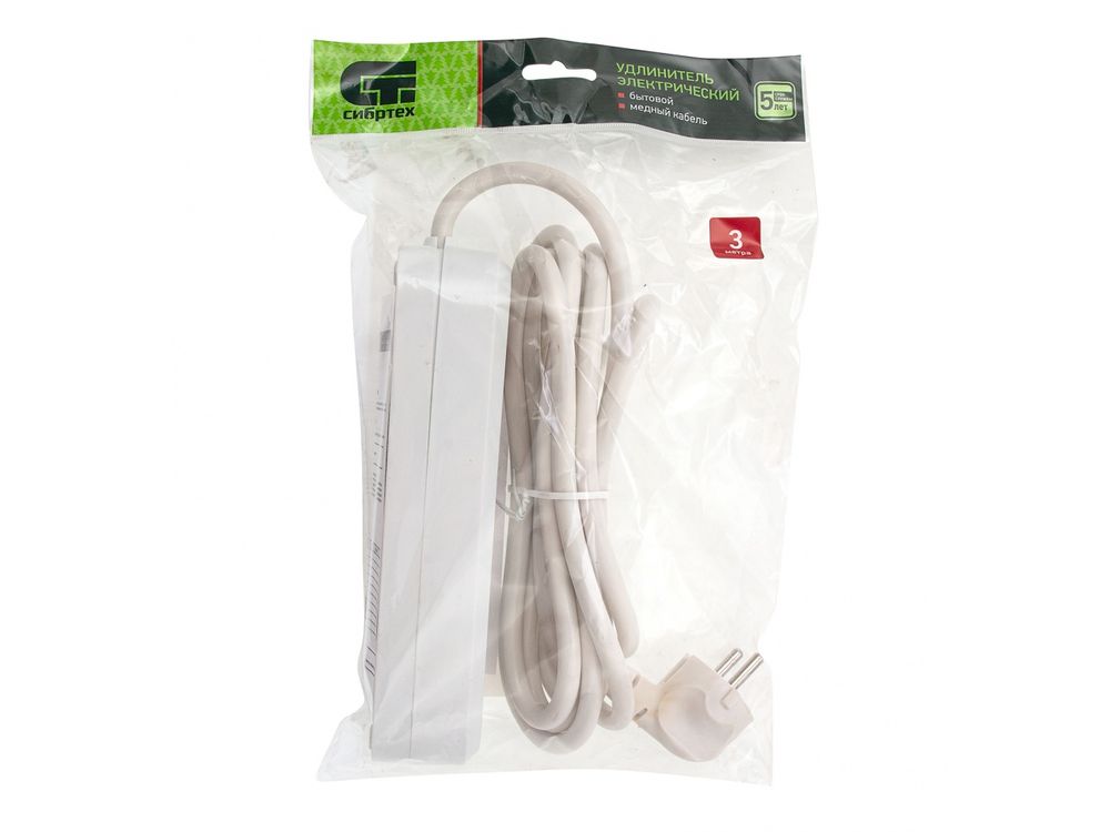 Белый бытовой удлинитель Сибртех 96081, тип УХз10, 10 А, с заземлением и выключателем, имеет 3 розетки для подключения бытовых и осветительных приборов на расстоянии до 3 м от источника электроснабжения. Медный кабель рассчитан на нагрузку до 2200 Вт. На корпусе имеется выключатель, упрощающий использование устройства. Удлинитель удобен для бытового применения.