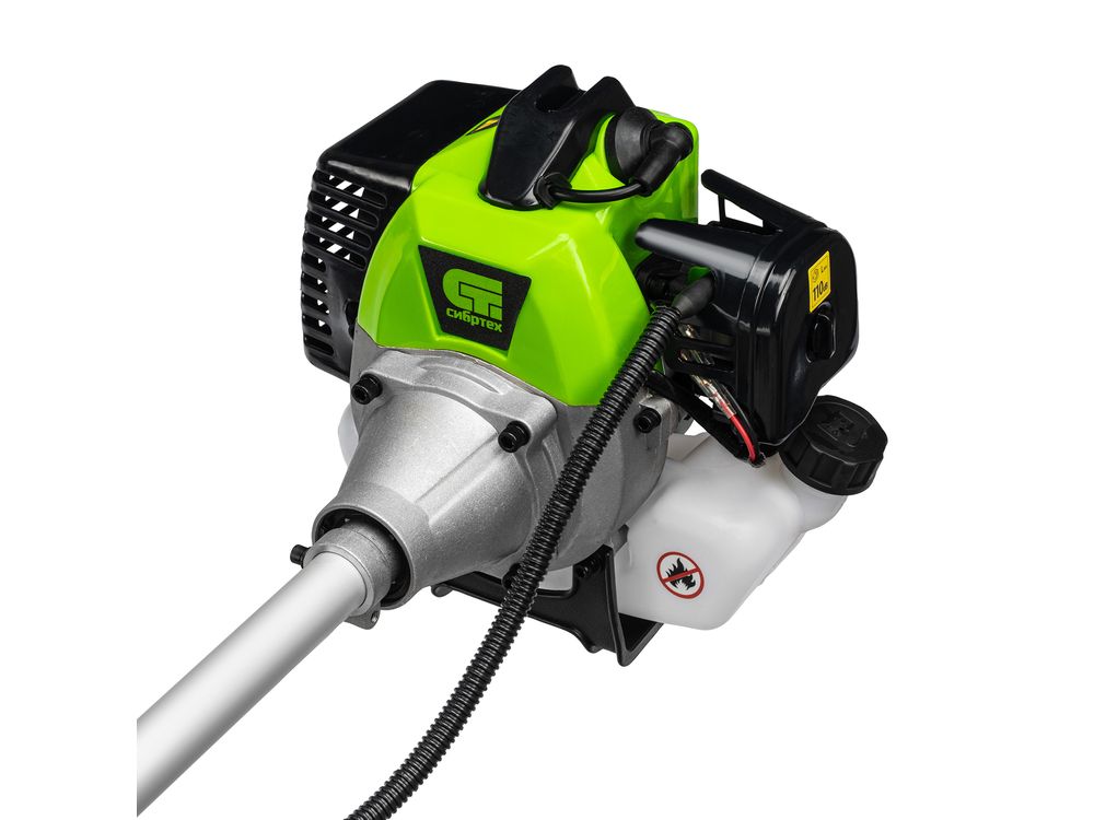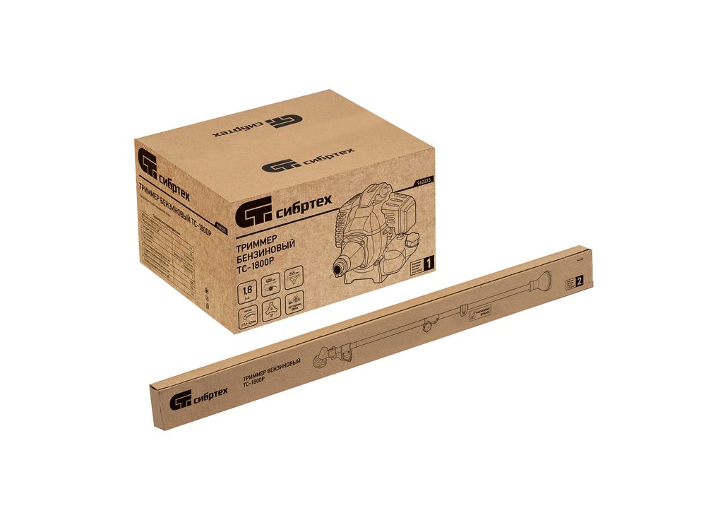 Триммер бензиновый Сибртех ТС-1800Р 962225 с двигателем объемом 33 см3 и разъемной штангой поставляется комплектом, состоящим из 2 частей. Используется для стрижки газонной травы и скашивания растительности. Входящий в комплект поставки трехлопастный нож позволяет легко справляться с густой, жесткой травой и толстыми стеблями сорняков. Оснастка вращается с частотой 9500 об/мин, ширина скашивания леской составляет 420 мм, ножом — 255 мм.