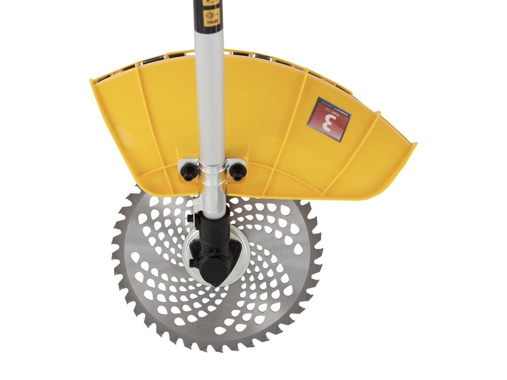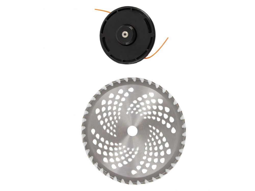 Дополнительные возможности — можно приобрести и установить на триммер диски Denzel 96323, 96325 для быстрого удаления растительности с жесткими стеблями (полыни, крапивы, лебеды), 96328 для скашивания молодых побегов кустарника диаметром до 3 мм.