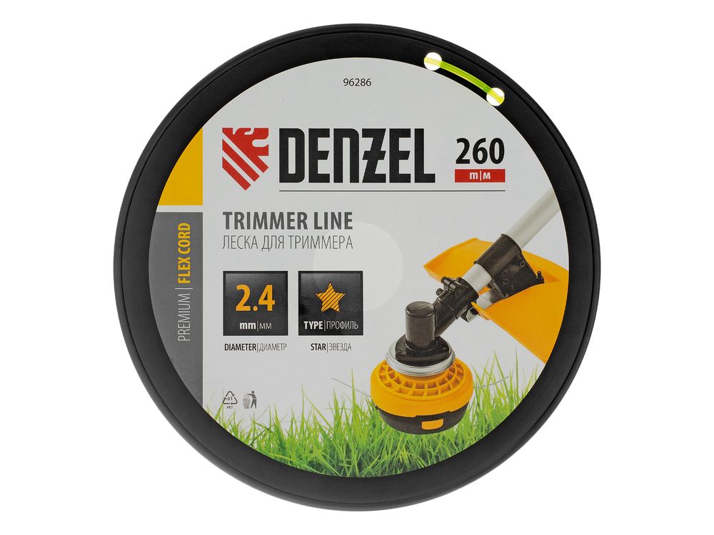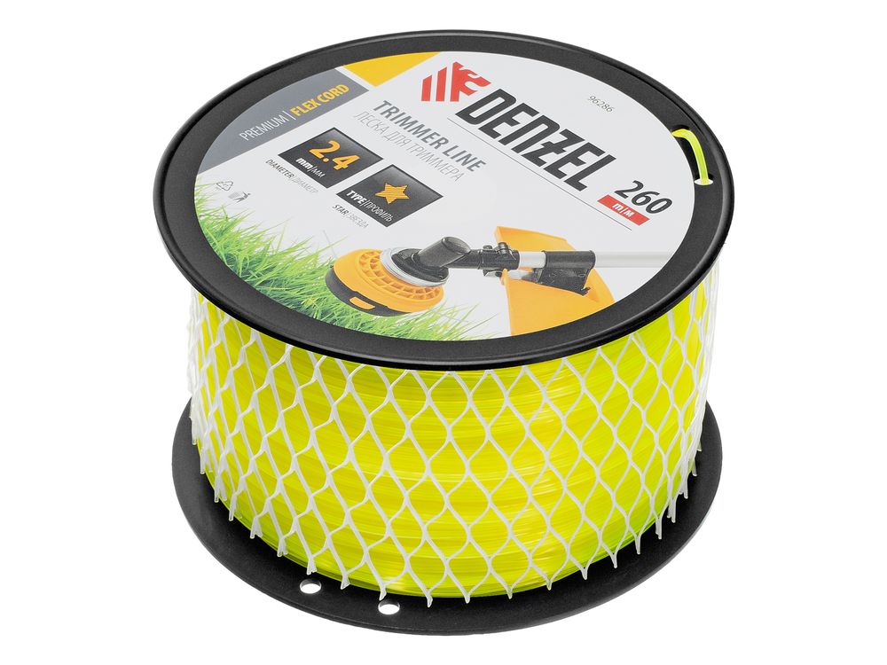 Леска для триммера Denzel FLEX CORD 96286 с сечением «звезда», диаметром 2,4 мм и длиной 260 м, на DIN-катушке, предназначена для скашивания газонной травы, также справляется с крупностеблевой растительностью. Эффективна даже на замусоренной территории. Заправляется в катушку бензотриммеров с объемом двигателя 25-52 см3 и электротриммеров мощностью от 1 до 1,5 кВт.