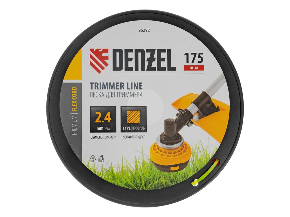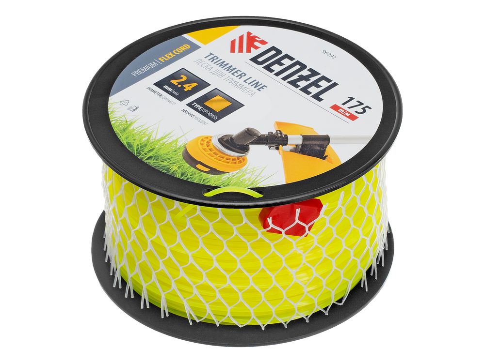 Леска для триммера Denzel FLEX CORD 96292 с сечением «квадрат», толщиной 2,4 мм и длиной 175 м, на DIN-катушке, предназначена для скашивания крупностеблевой растительности. Заправляется в катушку бензотриммеров с объемом двигателя 25-52 см3 и электротриммеров мощностью от 1 до 1,5 кВт.