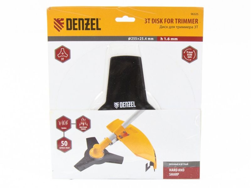 Диск для триммера Denzel 96325 размером 255 х 25,4 мм, толщиной 1,6 мм, с 3 лезвиями, предназначен для скашивания травы различных типов, в том числе с жесткими стеблями (полыни, крапивы, лебеды). Рекомендован к использованию со всеми типами бензиновых триммеров, а также с электрическими триммерами мощностью не менее 1,2 кВт, например, Denzel 96611 и 96612.