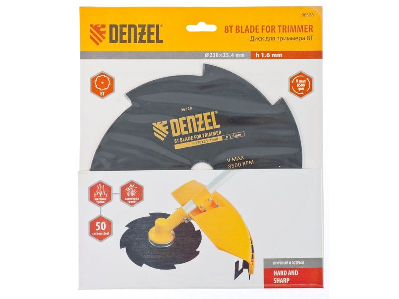 Диск для триммера Denzel 96328 диаметром 230 х 25,4 мм, толщиной 1,6 мм, с 8 лезвиями, предназначен для скашивания травы различных типов, в том числе с жесткими стеблями (полыни, крапивы, лебеды). Также способен скашивать молодые побеги кустарников с диаметром стеблей не более 3 мм. Рекомендован к использованию со всеми типами бензиновых триммеров, а также с электрическими триммерами мощностью не менее 1,2 кВт, например, Denzel 96611 и 96612.