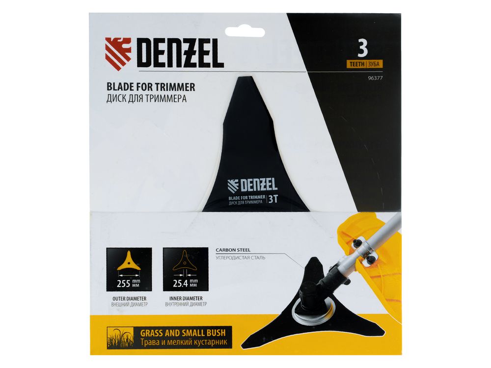 Диск для триммера Denzel 96377 с 3 лезвиями, толщиной 1,6 мм, с внешним диаметром 250 мм и посадочным — 25,4 мм, используется для скашивания травы и мелкого кустарника. Устанавливается на бензокосу или электротриммер с верхним расположением двигателя и прямой штангой. Позволяет быстро очистить от сорняков и крупностеблевой растительности территорию большой площади. Диск пригодится владельцам загородных участков.