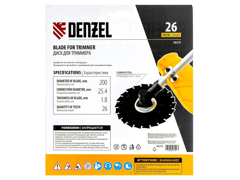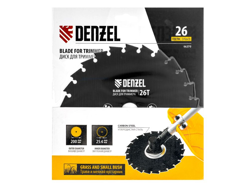 Диск для триммера Denzel 96379 с внешним диаметром 200 мм и посадочным — 25,4 мм, с 26 зубьями долотообразной формы, предназначен для скашивания травы и мелкого кустарника. Устанавливается на вал триммера с бензиновым двигателем. Диск пригодится для ухода за дачным участком.